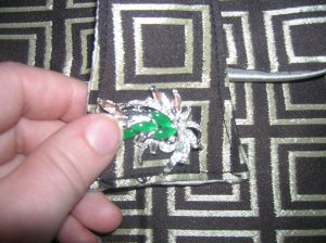 I used a magnetic snap as the closure. I was surprised the charmeuse was strong enough to handle the weight, but it’s doing a great job. And I reinforced the clasp with some sturdy cardboard.