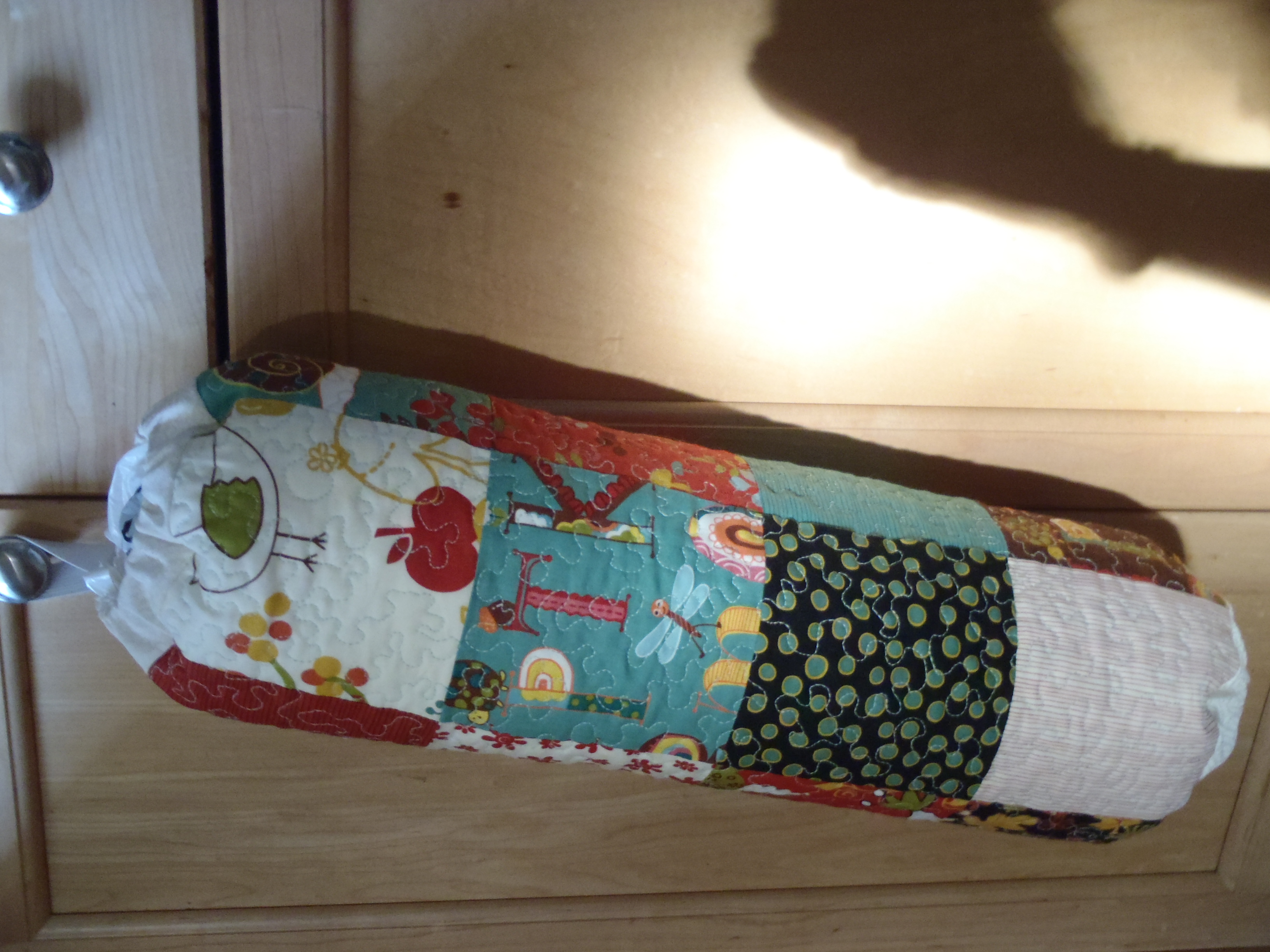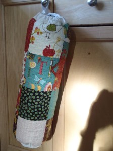 My other project for the weekend was making a plastic bag dispenser. We have loads of plastic bags that we keep corralled in the linen closet. They are unsightly and take up a lot of space. It’s something that I’ve been meaning to make for quite awhile, but other commissions and projects and children have taken up my time lately. This little project took me, cumulatively, 2 hours. In reality I was working on it all day in 5 minute bits. I used a charm pack of 5″ squares and the instructions from the Moda Bakeshop website. http://www.modabakeshop.com/2009/06/grocery-bag-despenser-tutorial.html