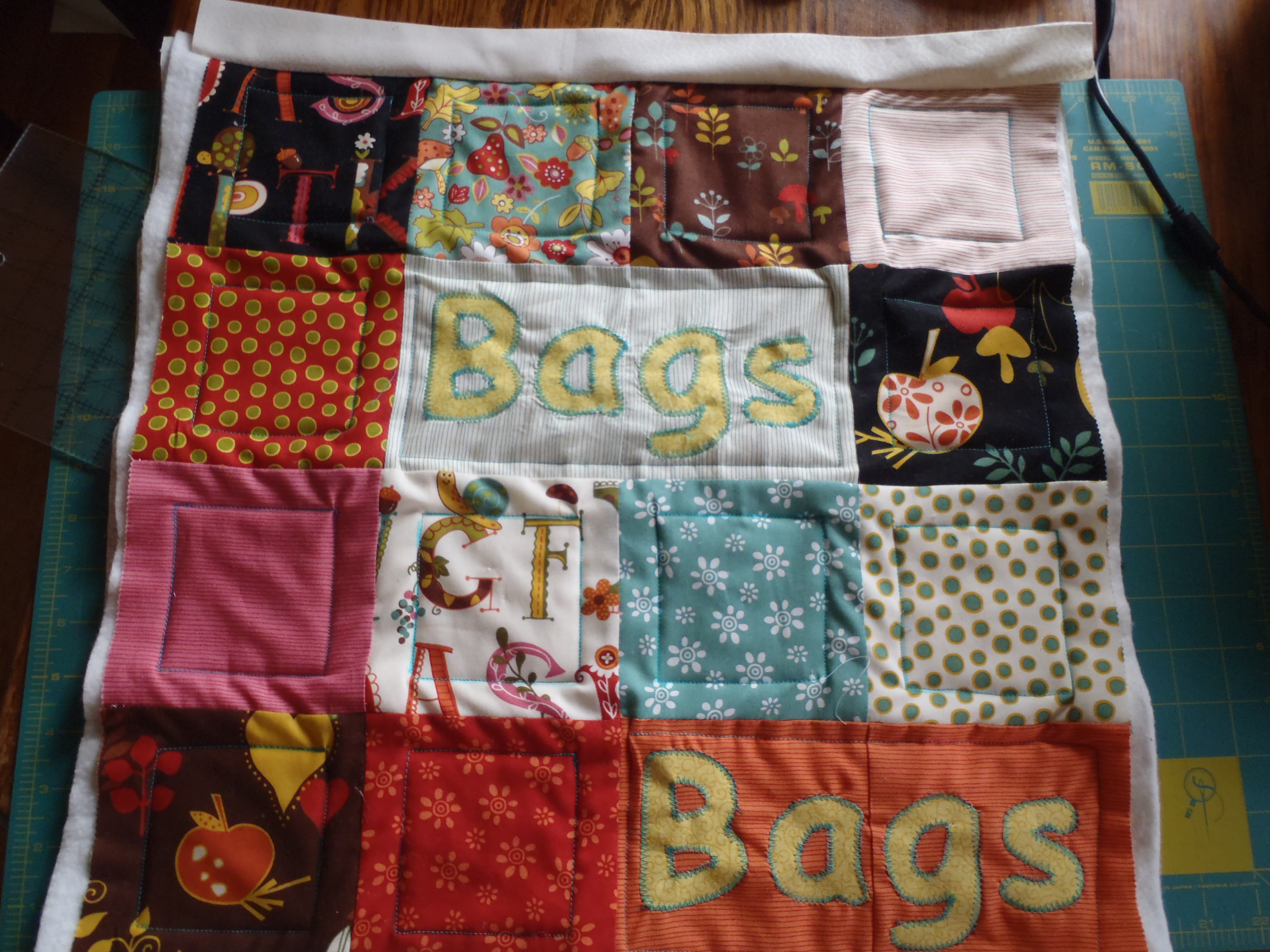 But I got some great ideas on applique from my sister-in-law. I added some letters to my plastic bag holder. Tapping into my creativity, I spelled out “Bags” in two places. Thrilling, I know. But this is good practice for some more ambitious applique that I’ll be attempting for another quilt.
