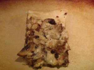Smear each dough with about 1/4 to 1/3 cup of the white sauce. Top with the mushrooms and onion mixture. Then pour the white sauce over the top of that. Sprinkle with about 2 T to 1/4 cup of Parmesan cheese. I think Gruyere would be great, too.