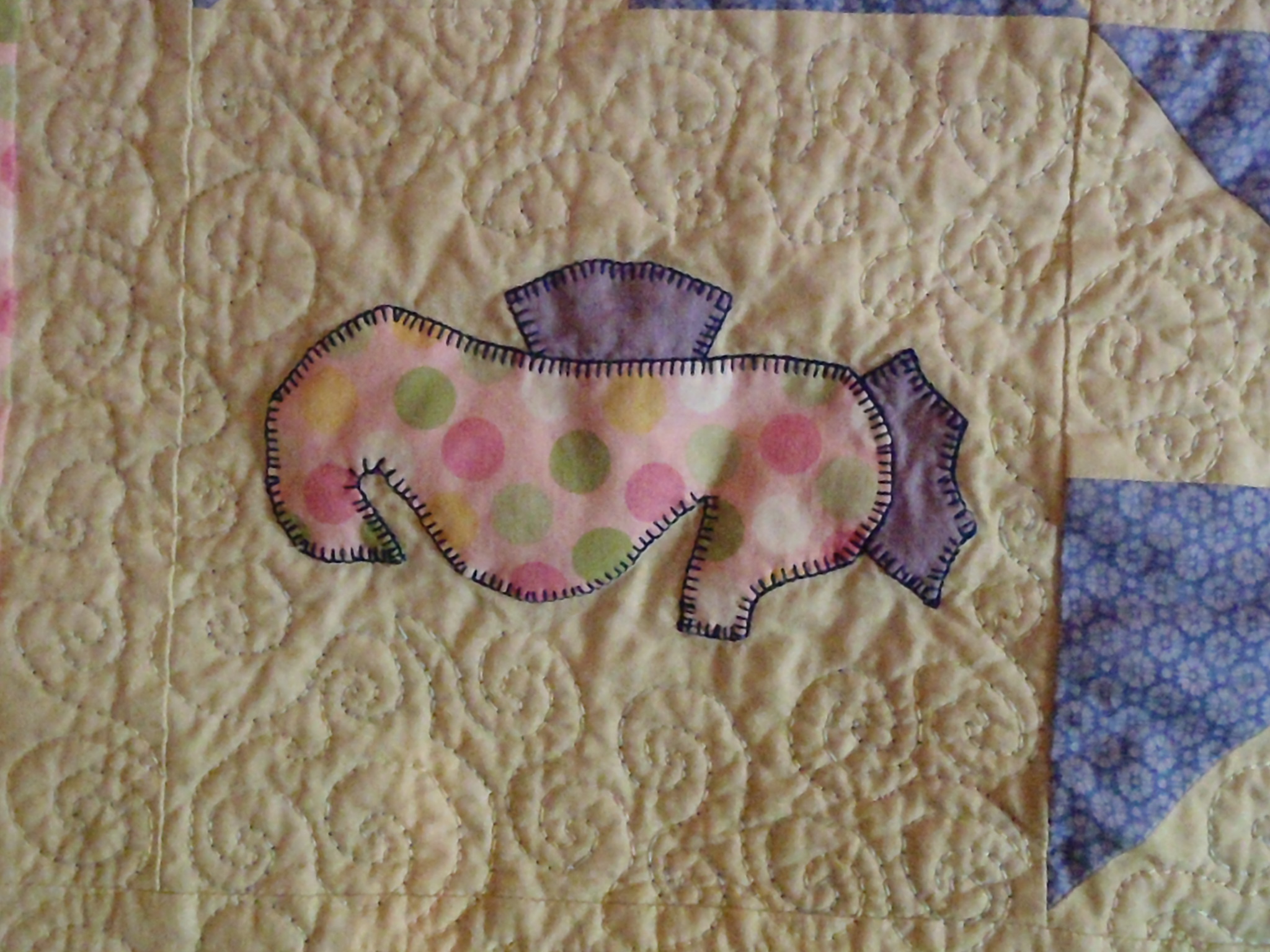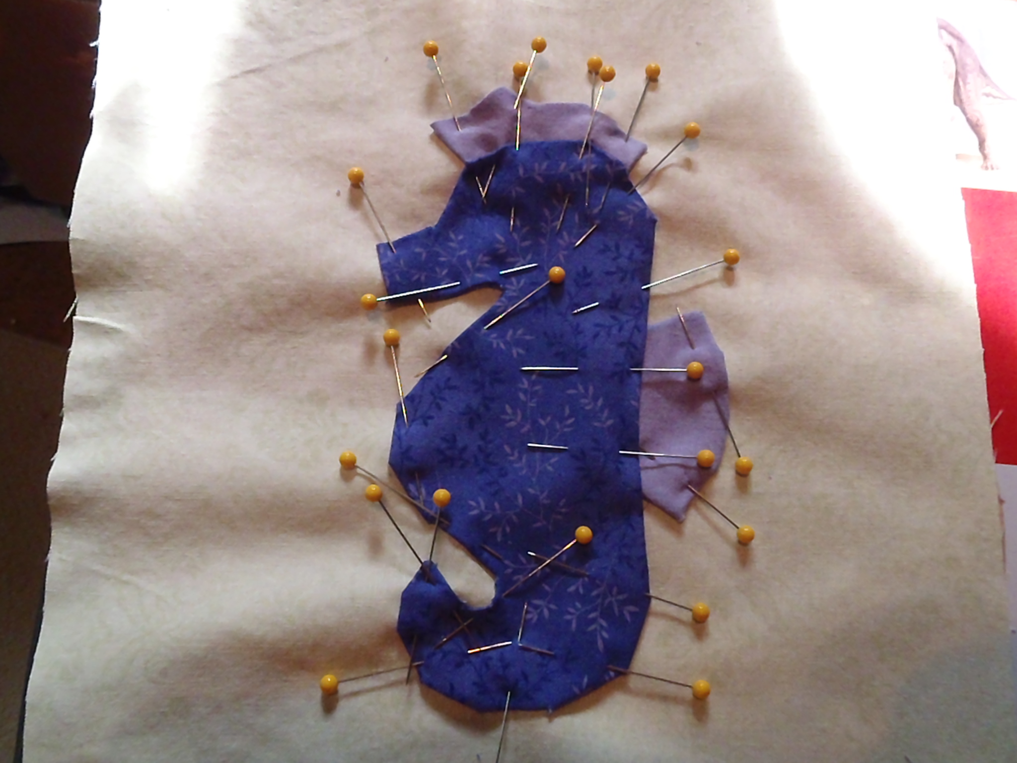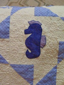 And just to give you and idea on how complex it is to do curvy applique, here is a picture of one of the seahorses in progress.