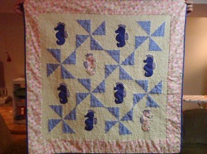 And now I’ve finished another quilt! It is for the baby of our dear friends, Alan and Liz. She was born in April and now the quilt is finished in time for her 6 week birthday.