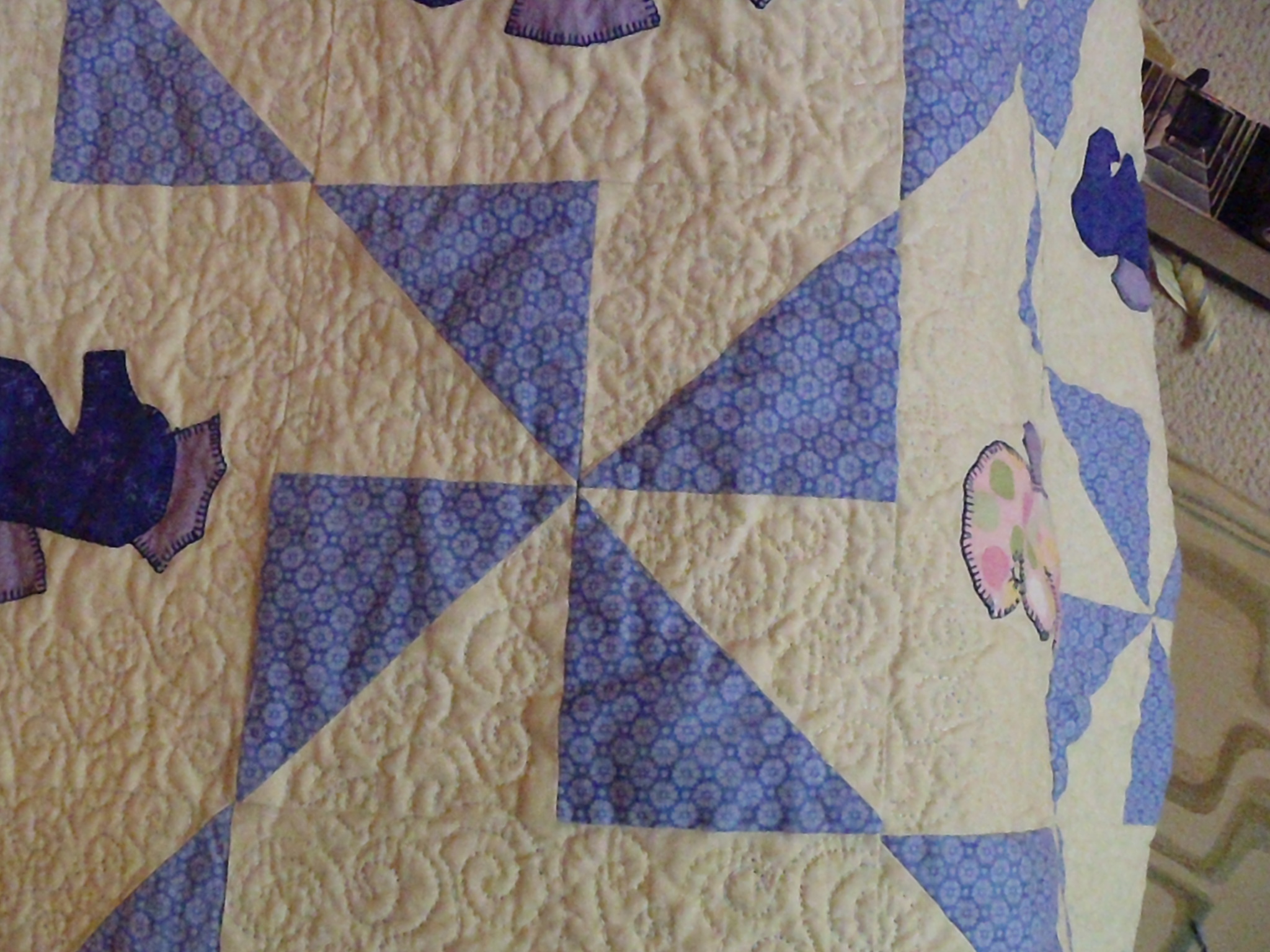 You can’t really see it, but the quilting thread I used is actual a multicolored pastel thread that goes from green to pink to blue to purple. I tried to capture on film, but it just didn’t show very well at all. The colors are very light and the change is subtle. I was really lucky to find a thread that happened to have all the colors that I was using in the quilt.
