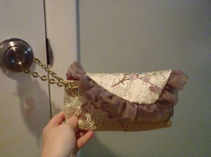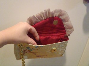 I made two. One exactly like the sample (I’m calling that one Elegant Chinese because of the fabric I used) and then one without the flat bottom and a cord to trim it rather than the frill (I’m calling that one Green and Gold). And then I took them over to my friend, Cate at http://www.etsy.com/shop/HeartOnMySleeveStore, and she added the charm bracelet handles.
