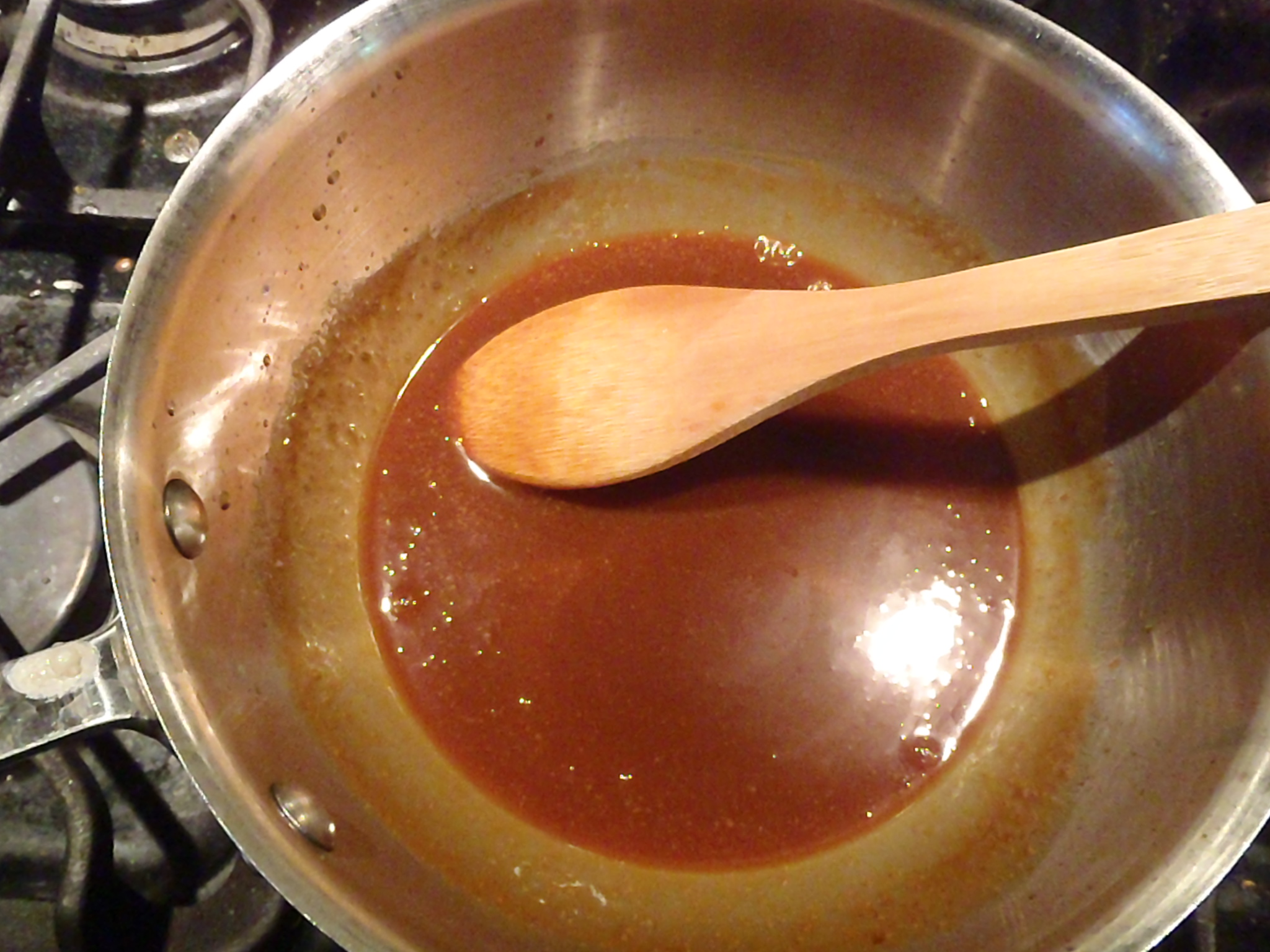 Once it had reached a good amber color, I took the almost caramel off the stove and *very, very, very slowly* started to add 1/2 cup heavy cream and 2 tsp of vanilla. Because the syrup and the cream are at such different temperatures they can create quite a show when mixed together. Even though I was adding a tablespoon at a time in the beginning the mixture was still bubbling and spattering, so be careful. It turned beautiful and glossy caramel. Set this aside for about 20 minutes or until it feel cool when you stick your impeccably clean finger in.