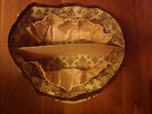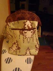 Because we’re talking about a woman with 2 small children and one on the way I wanted the diaper bag to be roomy and easy to quickly yank things out of. So I went with a lot of pockets inside, a pocket at each end, and a divider down the middle.