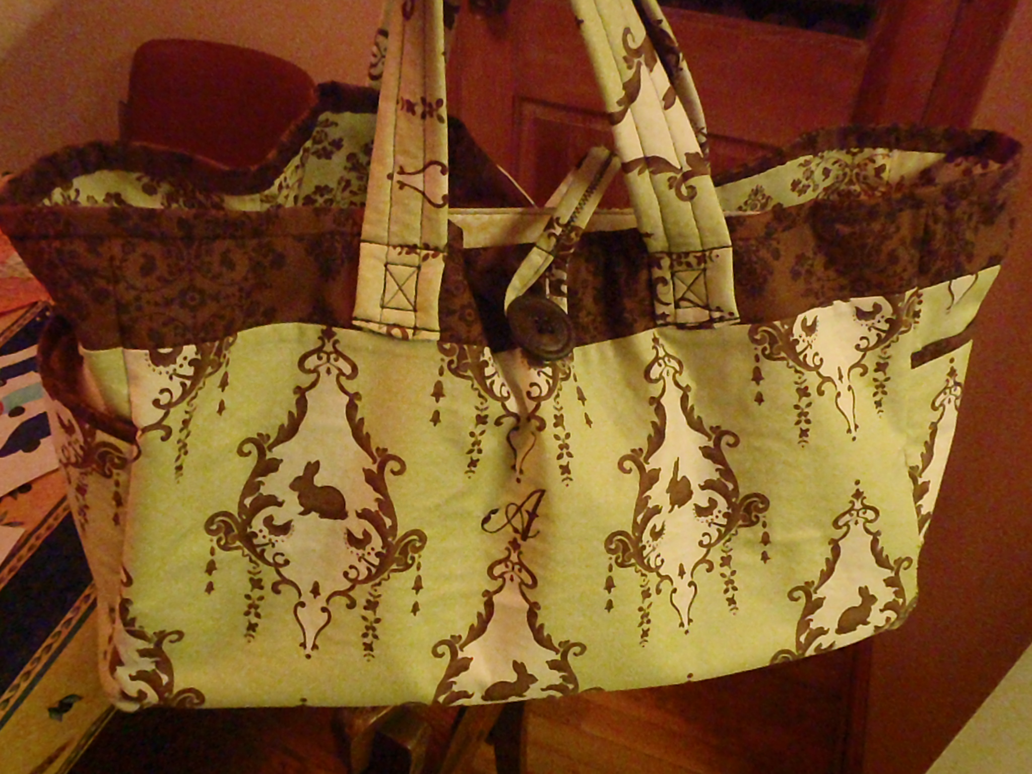I had the great privilege of making a diaper bag for a mom-to-be. It was commissioned by her boss. Now that’s the kind of boss I want to have! The mom has 2 small children already, just about my kids’ age, actually. This will be her third baby and her boss wanted her to have something nice for this new addition. (Again, what a boss!)