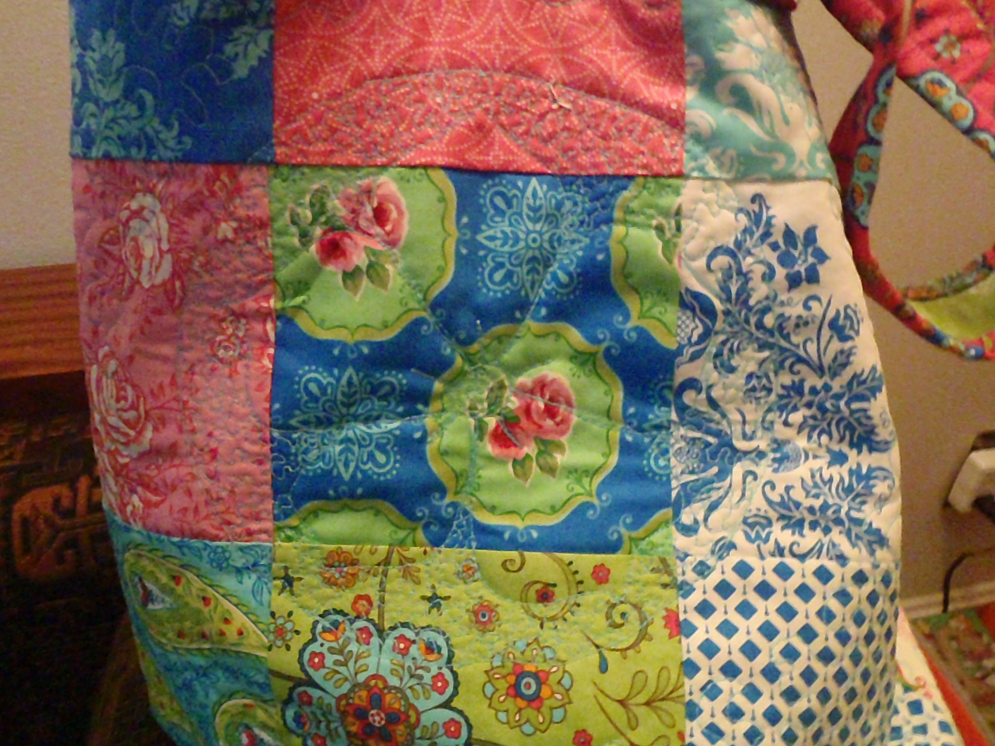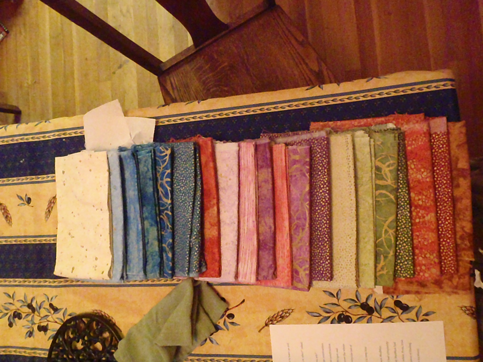 I revisited a Bargello quilting technique I’d read about. Bargello uses strips of fabric of graduated or complimentary color sewn all together to make a new textile, then cut apart and layered in a way that makes it look like the color is undulating. I had a bunch of jewel-toned fabrics with gold flecks and/or swirls on it so I decided that I would try a Bargello quilt.