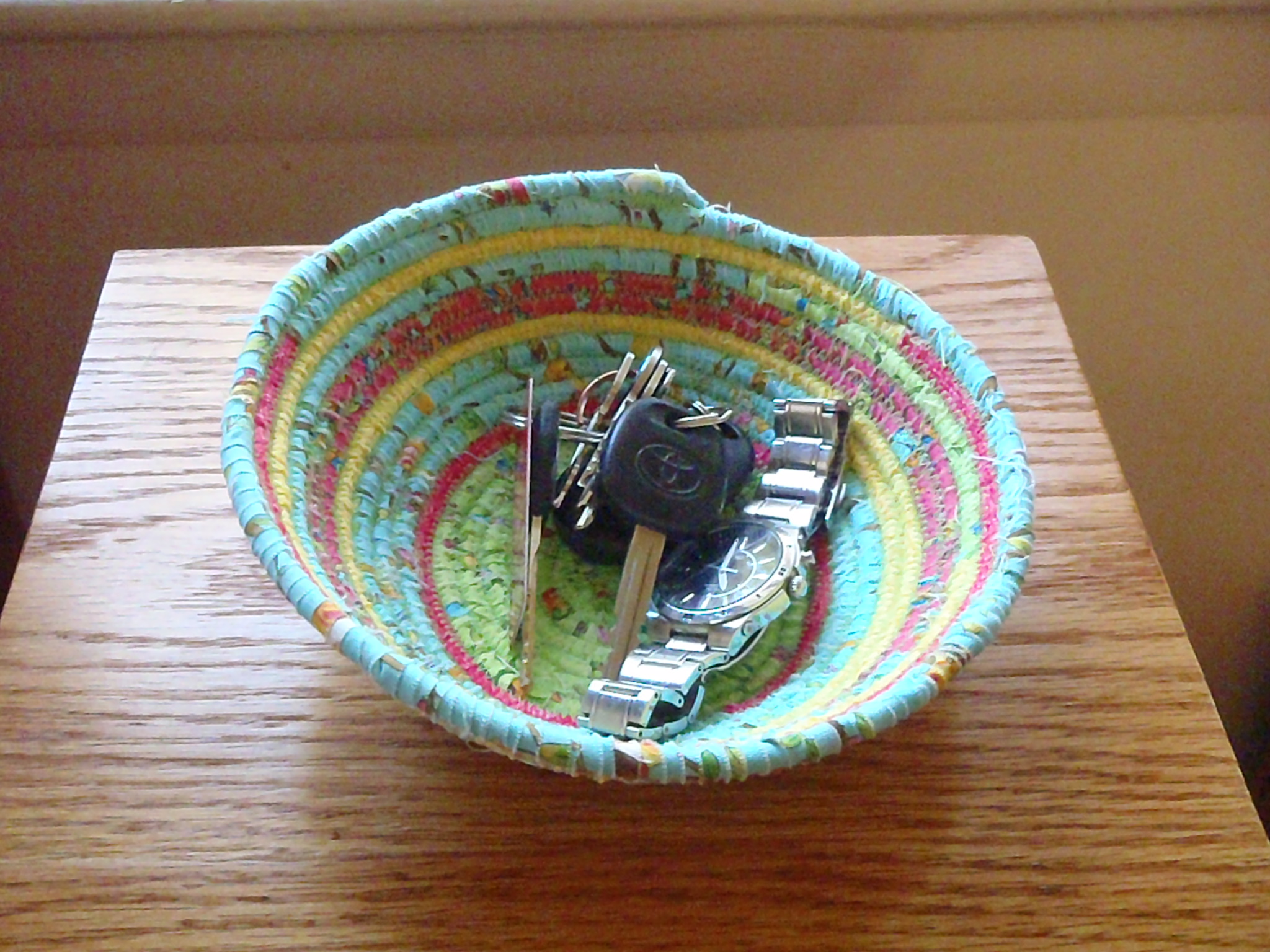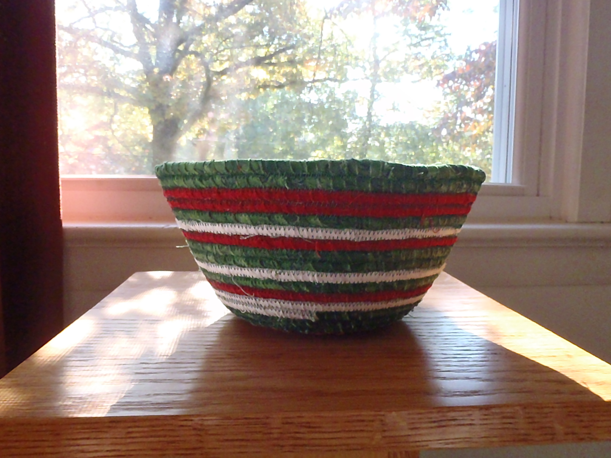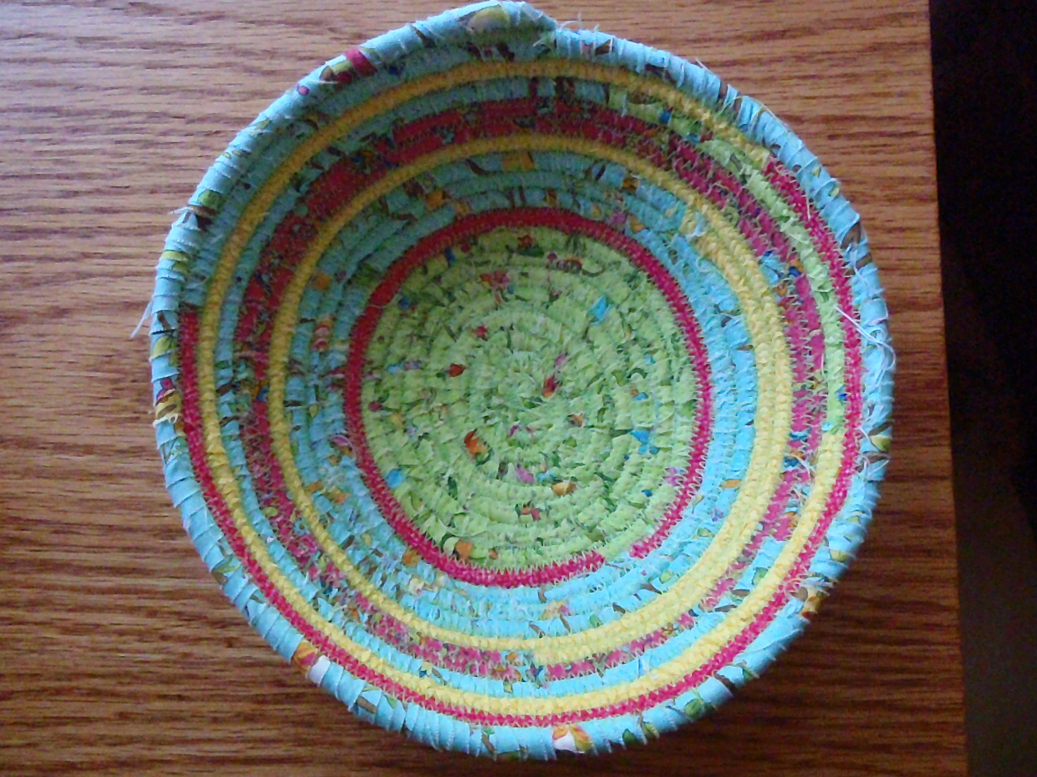 I first saw them in one of my quilting fabric stores holding some odds and ends that were for sale. If it had been for sale I would have bought it. Since it wasn’t for sale I made a mental note to look it up on the internet. It turns out the internet is a fantastic place and there about about 40 different kinds of ways to make a fabric bowl. But I finally found a blog with a tutorial on how to make a coiled fabric bowl.