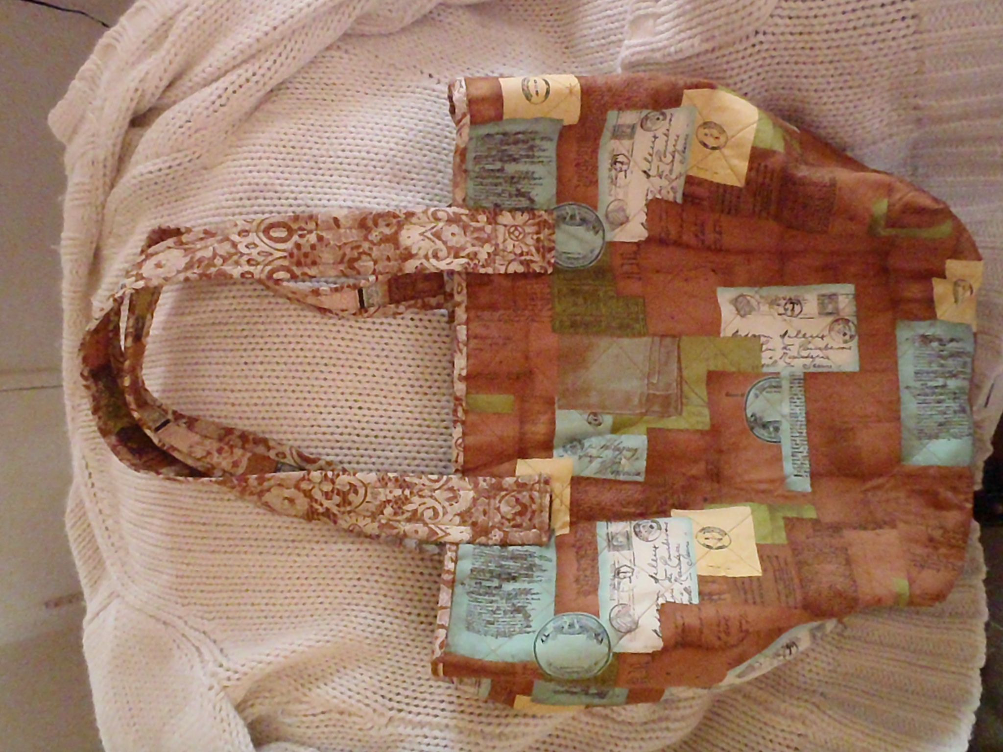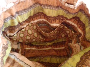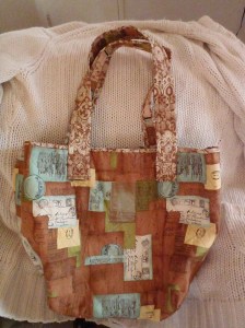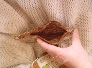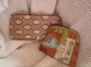 I really, really loved that fabric so I wanted to do a few more small things out of what I had left. So I put some iron-on vinyl onto the fabric I made the pocket out of and turned it into a zippered pouch. Then I took the fabric for the exterior of the bag and attached it to a purse frame. MY FIRST EVER! And it certainly won’t be my last. I love it. In fact, I may hide this down behind some things so it will be overlooked and I can take it home with me.