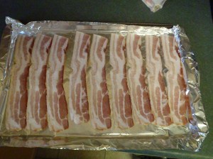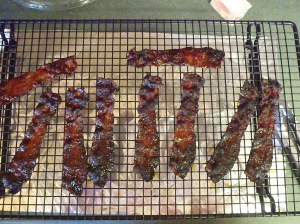 So, I began by candying my 9 pieces of bacon. An unusual process of coating center-cut bacon liberally with chipotle powder, a dash of cayenne pepper, a pinch of kosher salt, and a generous amount of raw sugar and then baking it in the oven. Half way through I flipped the bacon and coated the other side with the seasonings and sugar and finished the baking process.
