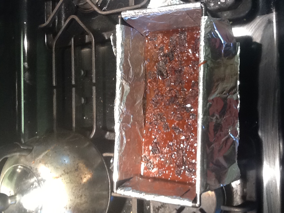 When you stir it together it gets all creamy and gooey and glossy and luscious. And then you stir in half of the bacon (chopped) and then the rest over the top of the caramel when you pour it into the loaf pan.