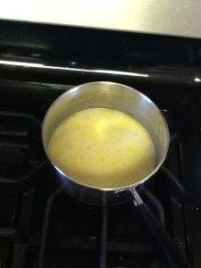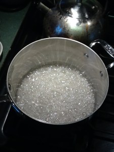 The most exciting part of candy making is boiling the sugar. This combo is sugar and corn syrup. And the cool thing is you just let it go until it starts to turn amber and then you start measuring temperatures. I highly recommend an instant read thermometer so you get a temp reading fast and you don’t burn the caramel. Because if you burn the caramel the only thing to do is cry, toss it, and start over. I also highly recommend you don’t drop your instant read thermometer into the sugar. It comes out looking like a prehistoric bug covered in amber.