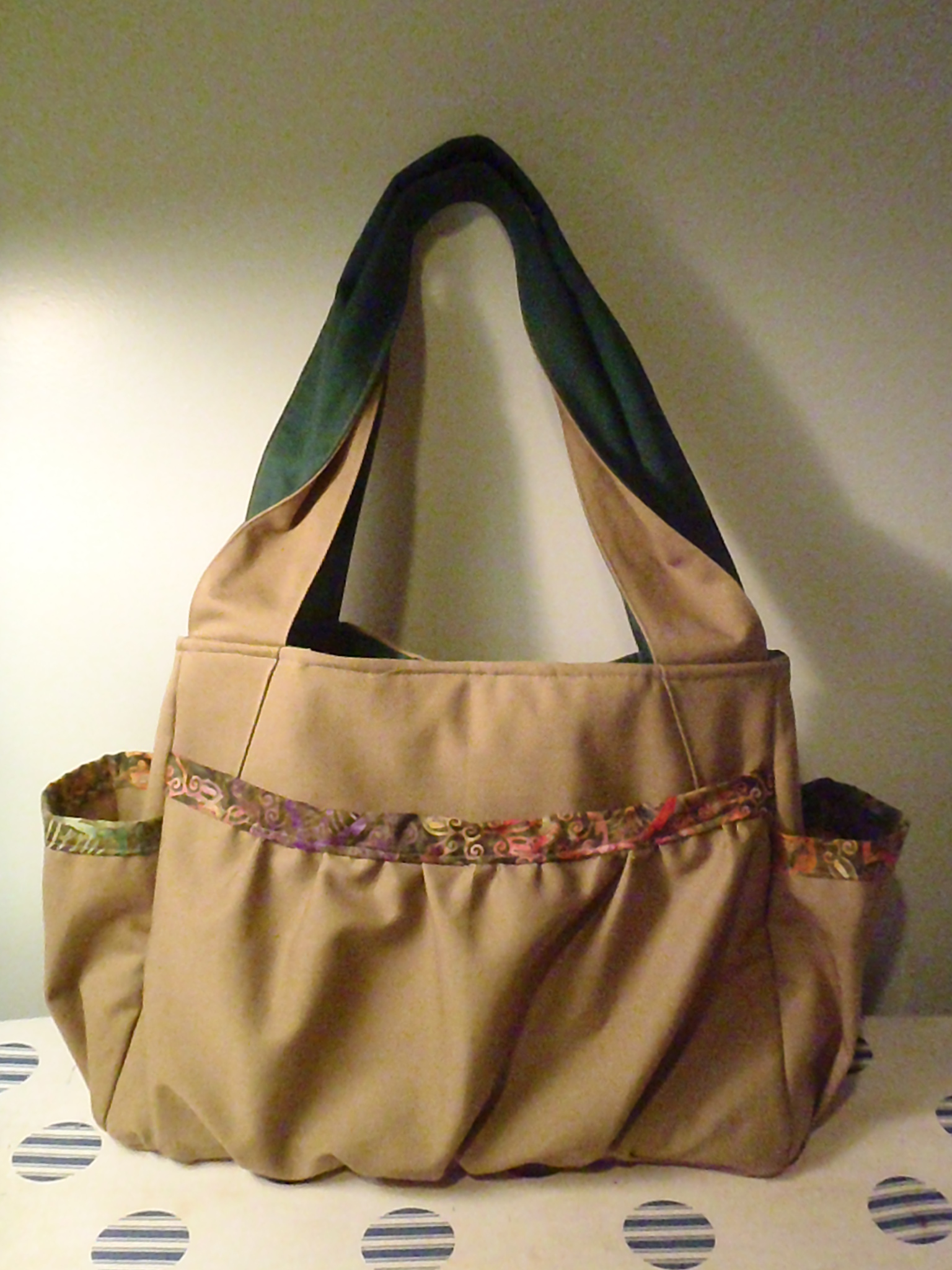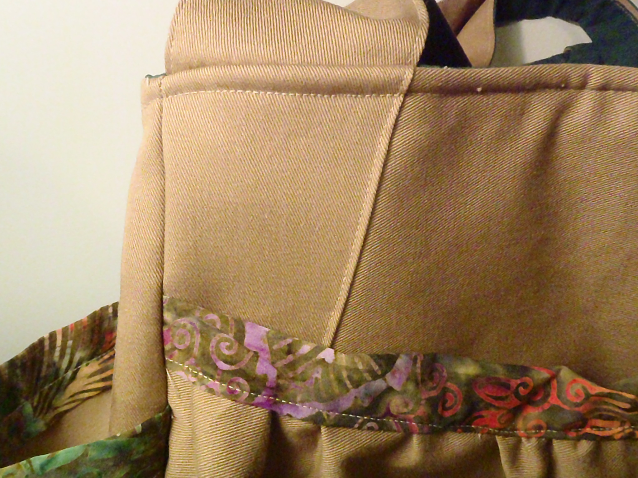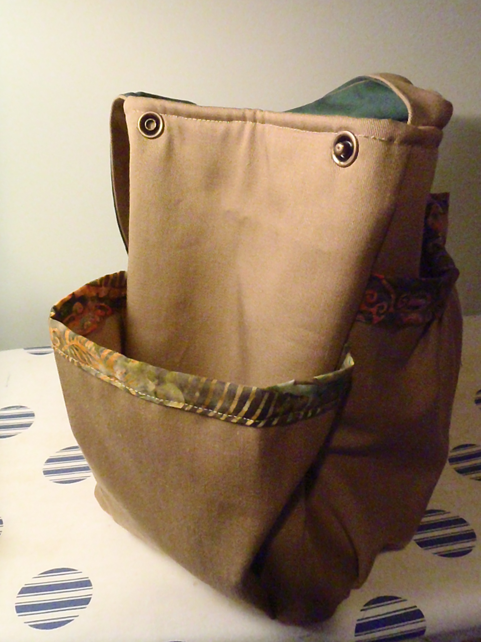 And I love Ingrid. She is named after a friend of mine and like that friend she is stylish, tough, and ready for anything. The exterior is canvas, lined with a quilting cotton, and trimmed with a batik. This bag can go into the horse barn, haul tons of kid supplies, be ready for camping, and go on a fabulous trip to Jamaica – just like Ingrid.