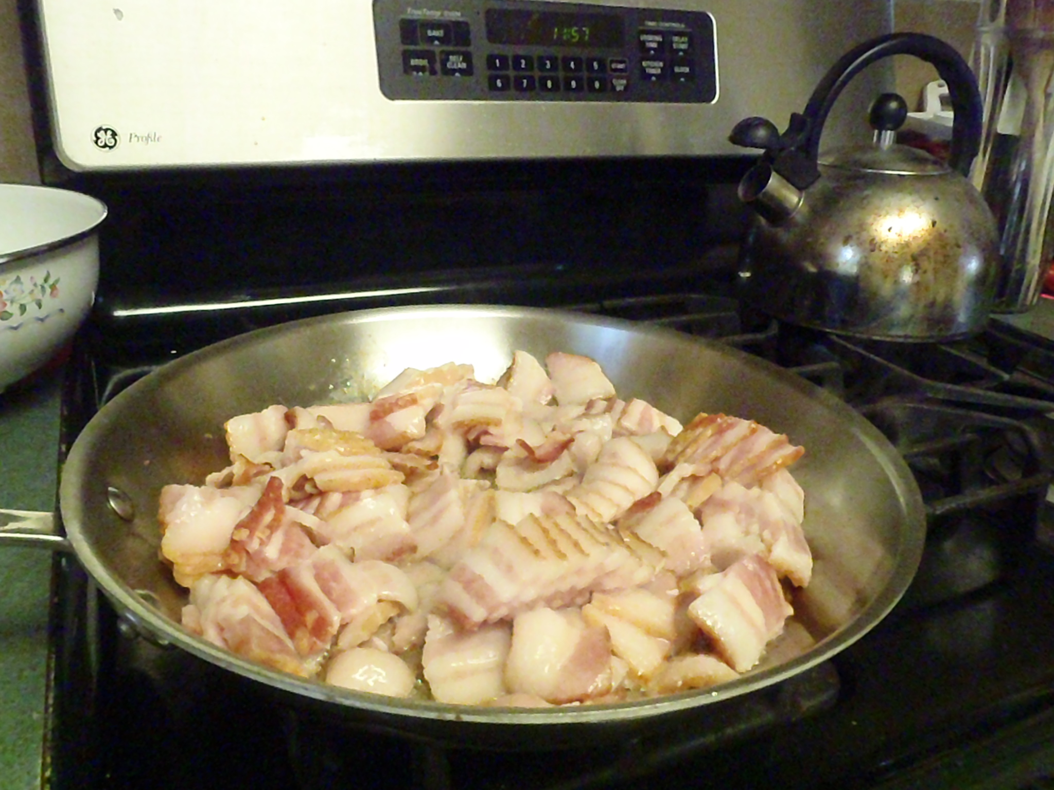 - 1 1/2 pounds sliced bacon, cut crosswise into 1-inch pieces
