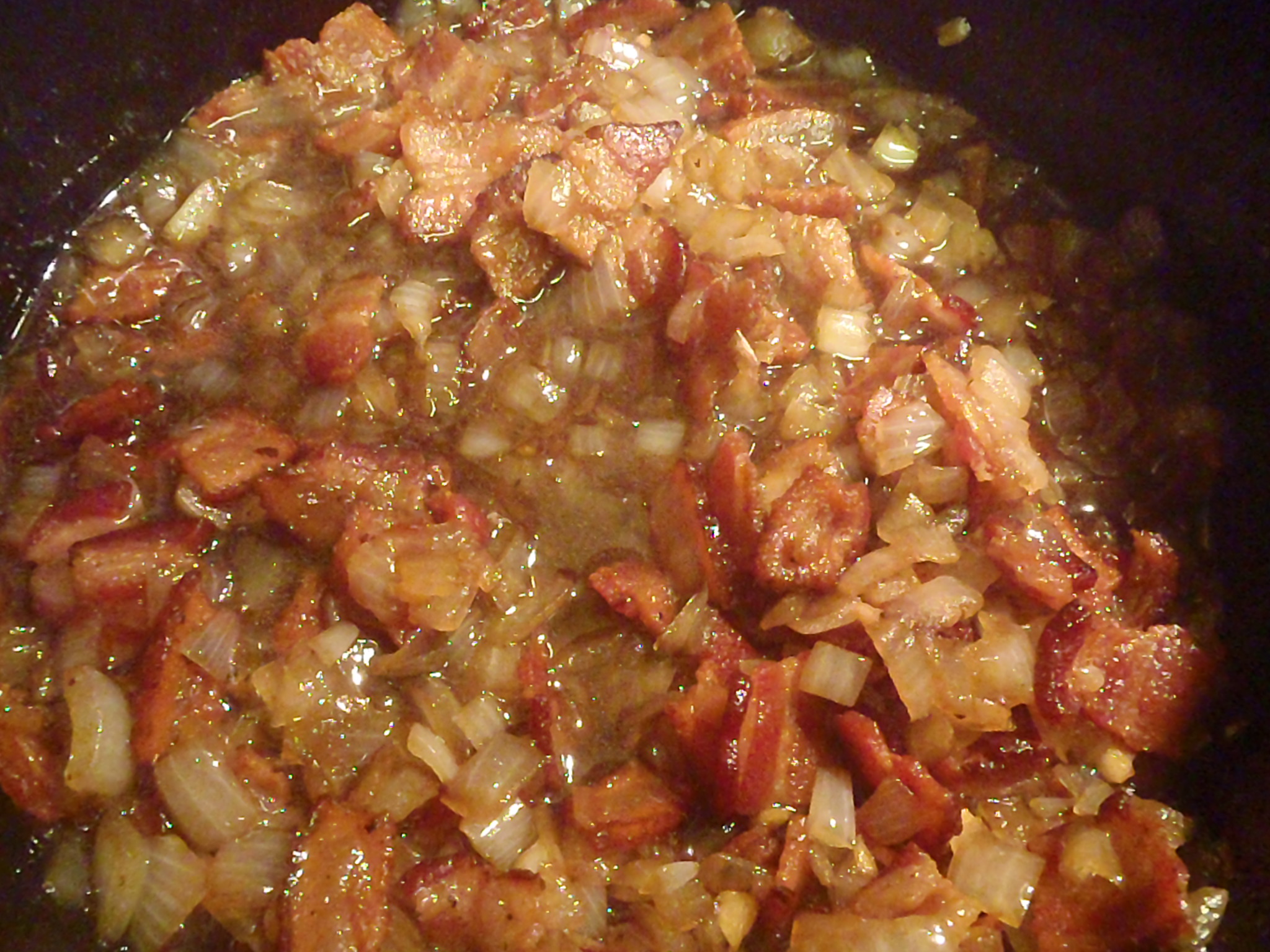 There is a little bit of cooking to do before getting to the “slow cooker” part of this recipe. Cook bacon over medium-high in a large skillet, stirring occasionally. You want all the fat to be rendered and the bacon browned, but not really crispy. (about 20 minutes, or so.) With a slotted spoon, transfer bacon to paper towels to drain. Pour off all but 1 tablespoon fat from skillet; add onions and garlic, and cook until onions are translucent, about 6 minutes. Add vinegar, brown sugar, maple syrup, and coffee. Bring to a boil, stirring and scraping up browned bits from skillet with a wooden spoon, about 2 minutes. Add bacon and stir to combine.