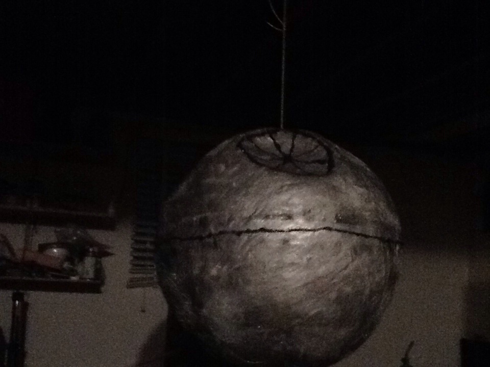 A dramatic shot of the Death Star Pinata in the half-dark. Kind of glittery and foreboding. And loaded with candy. Yummy, yummy candy.