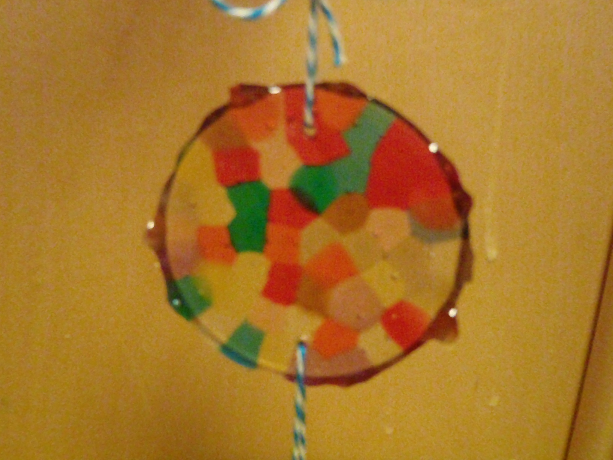 They next step was to drill holes into the plastic in order to thread our string and get them to be hanging suncatchers. I found something called Baker’s Twine to use. It was a fun multi-colored and lightweight twine that added some wonderful fun to the design. Here they are!!