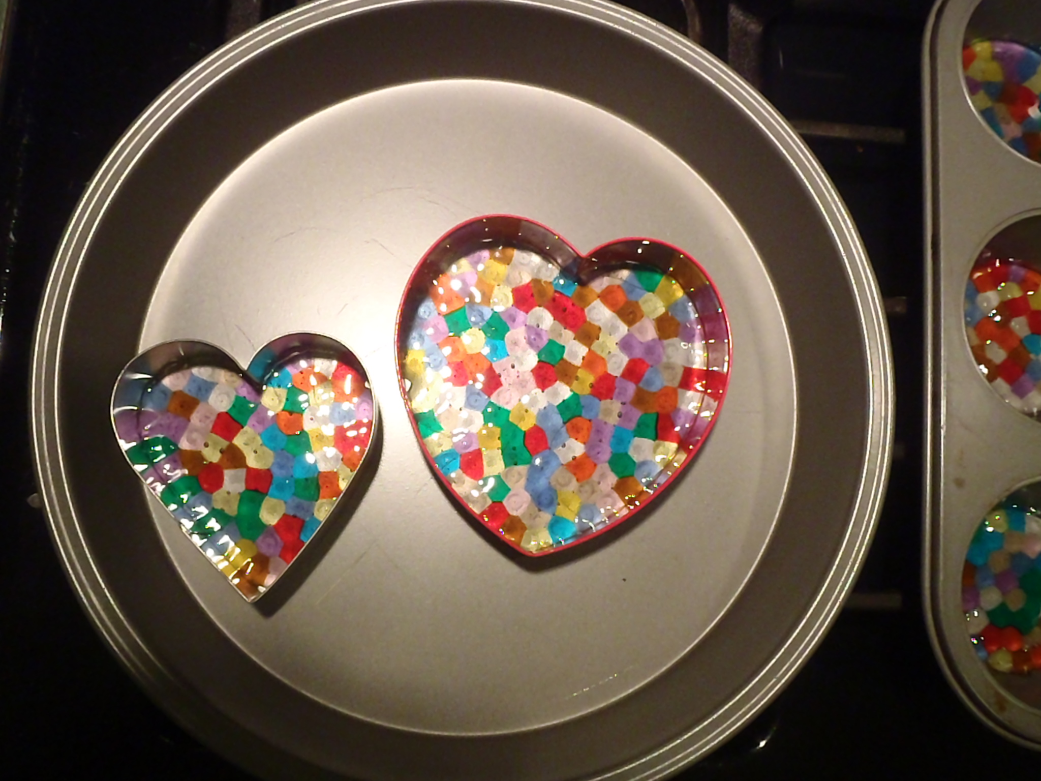 I had the kids fill their cookie cutters and muffin tins with the beads in whatever form they wanted. I’d seen people do designs and patterns, but my guys seemed to like the random approach.