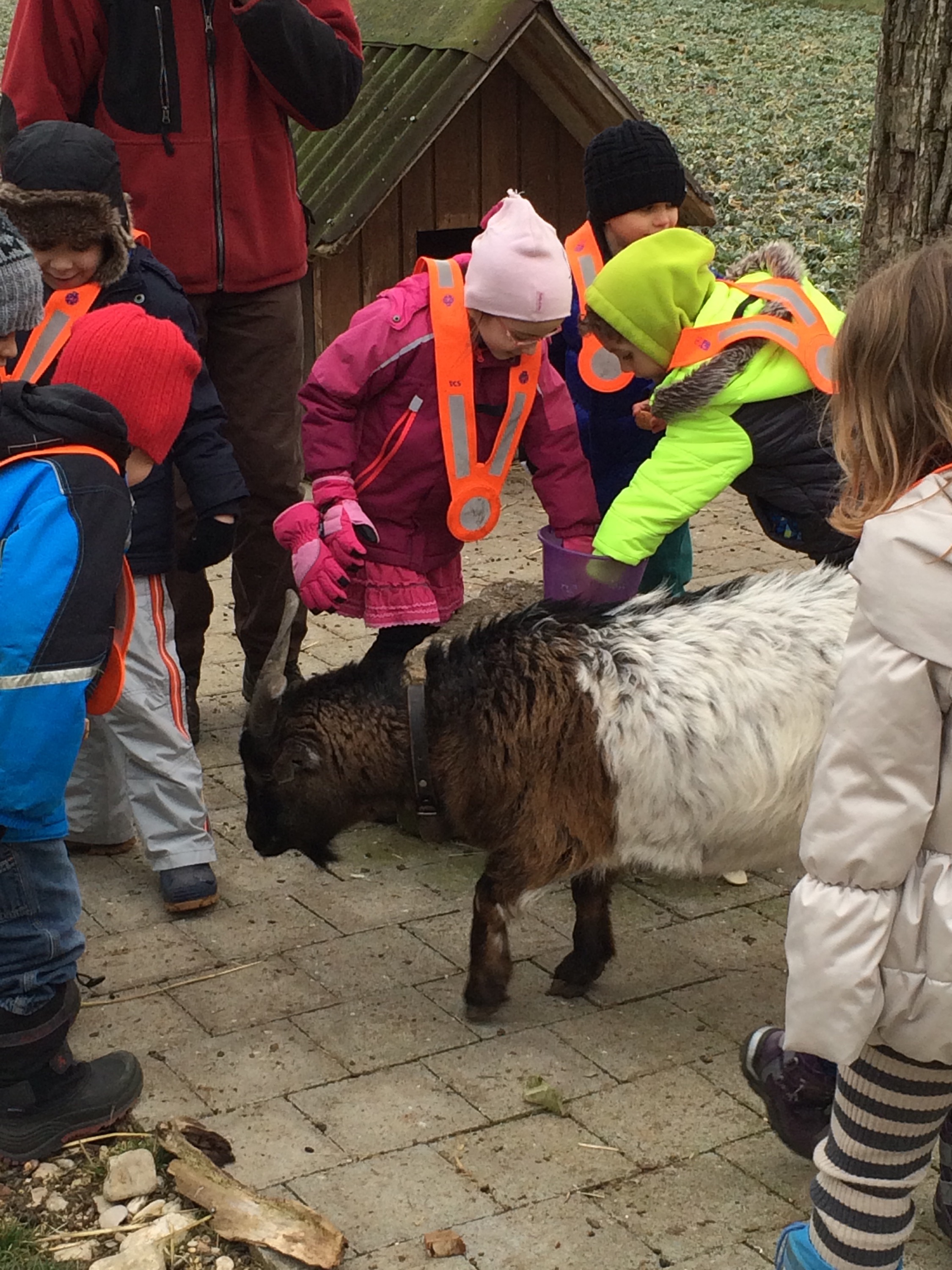 The children were feeding them bread. They were the 3 Billy Goats Gruff. The two small ones ran away, presumably frightened by the hoard of adoring 5 year olds assaulting them with stale bread. The big one, who had been around long enough to realize Children = Food, had stayed out for the bread the kids were feeding to him.