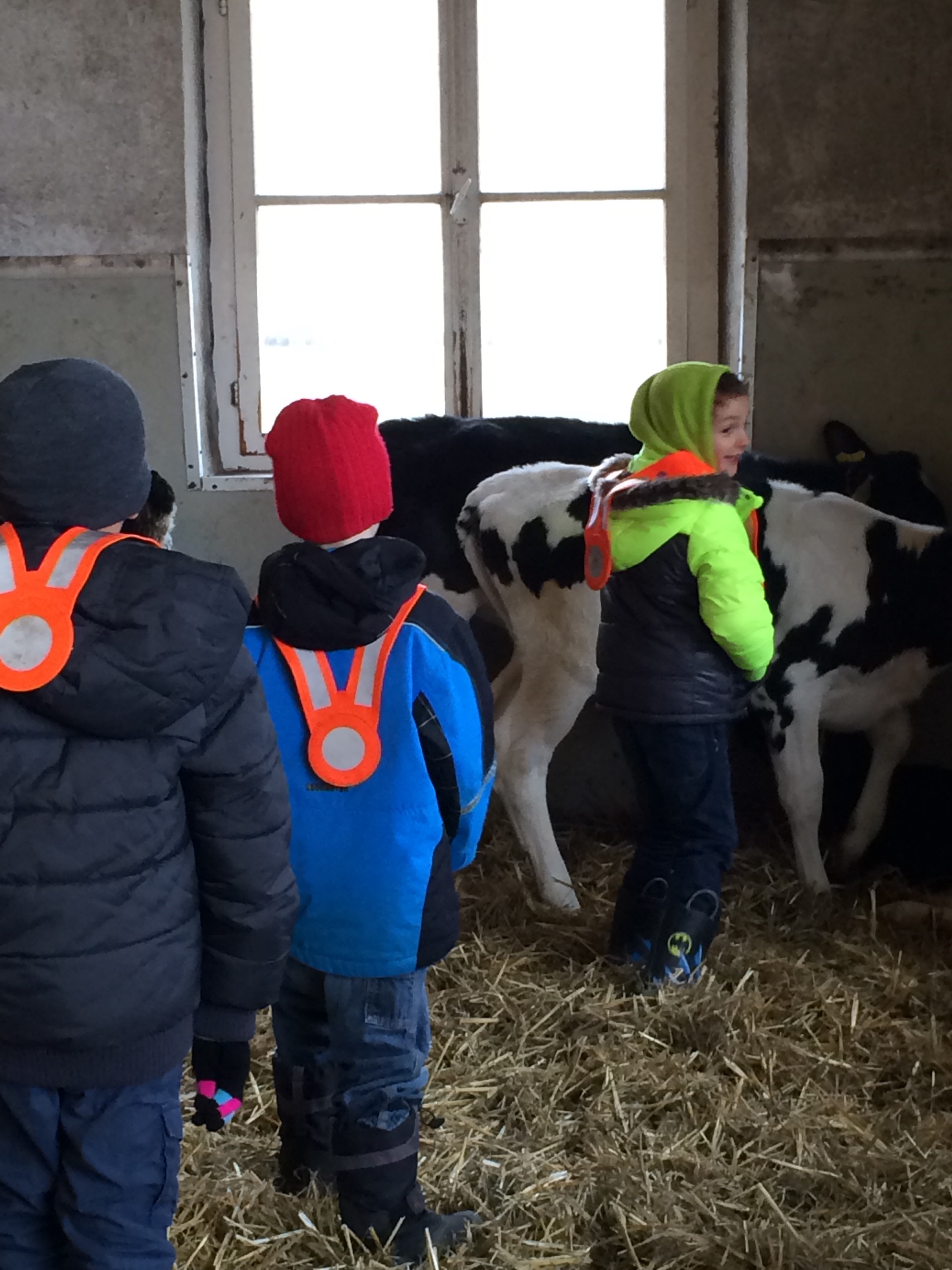 Well, Swiss Family Carlson members H and Mom went to a farm. H’s Kindergarten class is studying “where our food comes from” for 6 weeks. Two weeks ago they went to a grocery store and looked at all the fruits and vegetables as well as the bakery area, butchery, and the shelves full of all the dry goods. They’ve watched a video or two, read books, done art activities, and learned songs and poems. Earlier this week they made butter and ate it on crackers.
