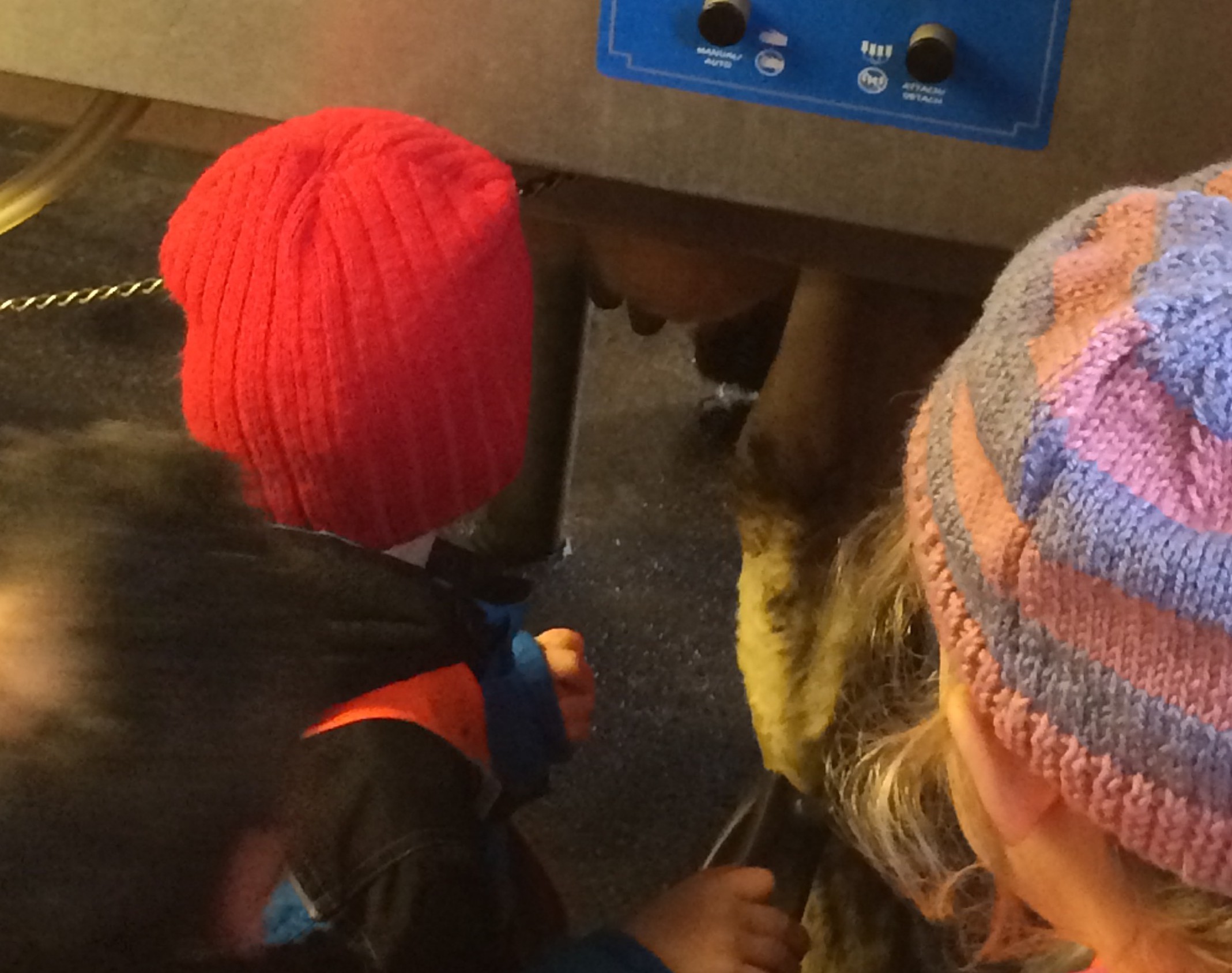 And proving that the farmer knows his audience, he had about 20 different toy ride-on tractors for the kids to play with while they waited for everyone to have their turn at milking. The children had an absolute blast. And, Dad, I tried to get him to play with the green tractor, but he really wanted to ride this New Holland. I’ll do better next time.