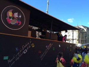 The parade for the kids on Tuesday was so much fun! The Waggis and Uelis handed out oranges, bananas, flowers, small stuffed animals, and candy! Oh. And confetti! They had confetti cannons, they whipped out 5-gallon bags of confetti and dumped it over the crowd, and they even grabbed a couple of people, pulled them into their cart, and stuffed their coats full of confetti! That is apparently what happens if they catch you not wearing a plakette. A warning to the wise: buy a plakette.