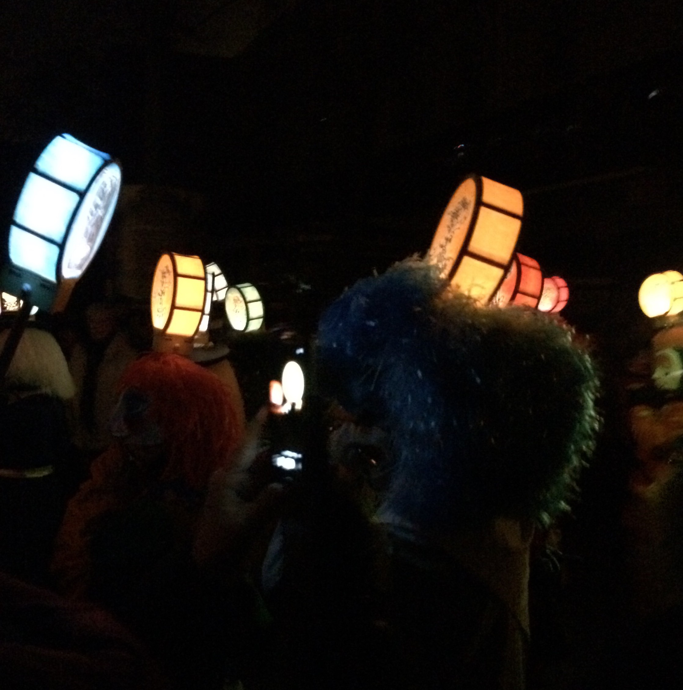 All of those lanterns are sitting on the heads of our Waggi drum and pipe corps. I have no idea how heavy they are with the heavy masks, but they played and marched for over an hour!