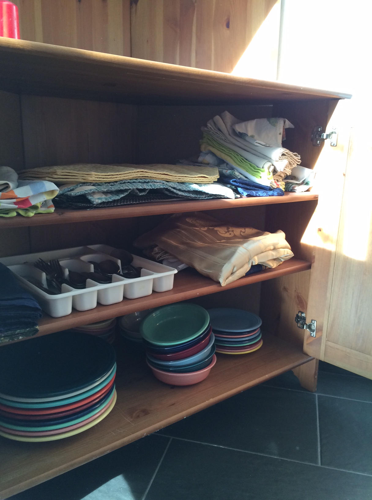 If they are going to set the table, move the plates, silverware, napkins, and cups down to a drawer or cupboard at their level.