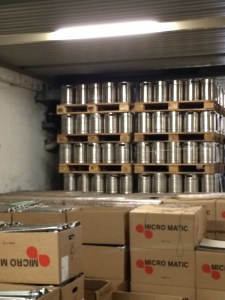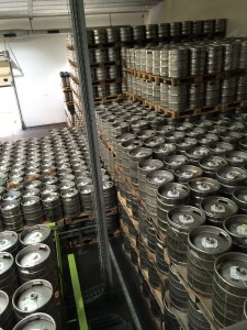 See! The keg room!  The round thing is like a keg merry-go-round.  The kegs wait nicely in a row and each take their turns slowly whirring around until they are full.  When they have had enough they get off near the palette area, where they are lovingly forklifted into a shipping area.