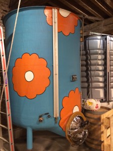 The Marchand winery is owned by a man our age (so very, very young) who had local artists paint his gravity pressing barrels.