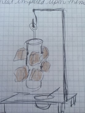 In particular Emilie’s serves what our oldest defined as a “meat chandelier.” I thought they looked like metal bird feeders with meat spiked where the bird would rest to peck out the seed. It’s quite an elaborate contraption. I couldn’t take a picture so the best I can do is this sketch.