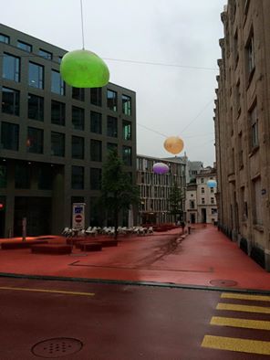 The Stadtlounge area of St. Gallen. Blocks of the main city covered with that spongy playground material. The kids absolutely loved it! Even the street is red!