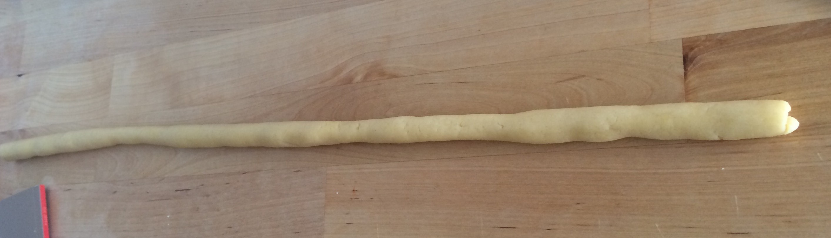 The dough isn’t like play dough.  It has more substance so I needed to use some pressure to get it to start to spread out as I rolled it.  However, as I rolled the dough back and forth my hand heated the butter in the dough, causing it to melt.  The melting creates air pockets in the dough and as I rolled the snake back and forth the ends started to break apart.  I took off a bit and kept rolling, trying to get a nice 1/4-inch to 1/2-inch diameter tube, but the dough started to split down the middle of the tube and it all shredded apart in my hands.