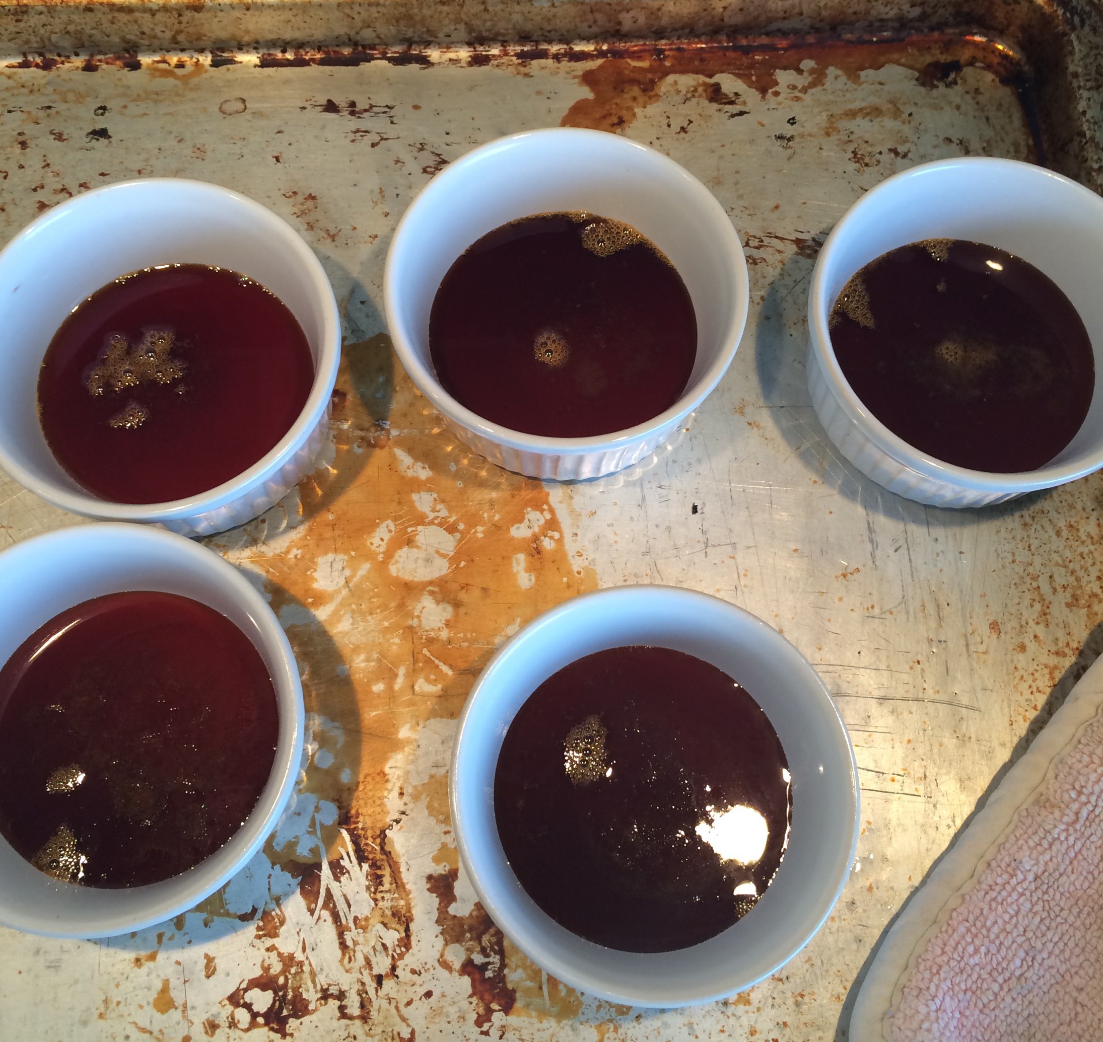 I had to fiddle with the temperature of the oven quite a bit. I was convinced there were bubbles around the edge so I turned down the oven. Then they weren’t done after 30 minutes so I cooked them longer. Fiddling with the oven temps adds to the danger of over cooking. You don’t want the custard to be too loose, but you don’t want it extremely firm either – just a bit wobbly in the middle.
