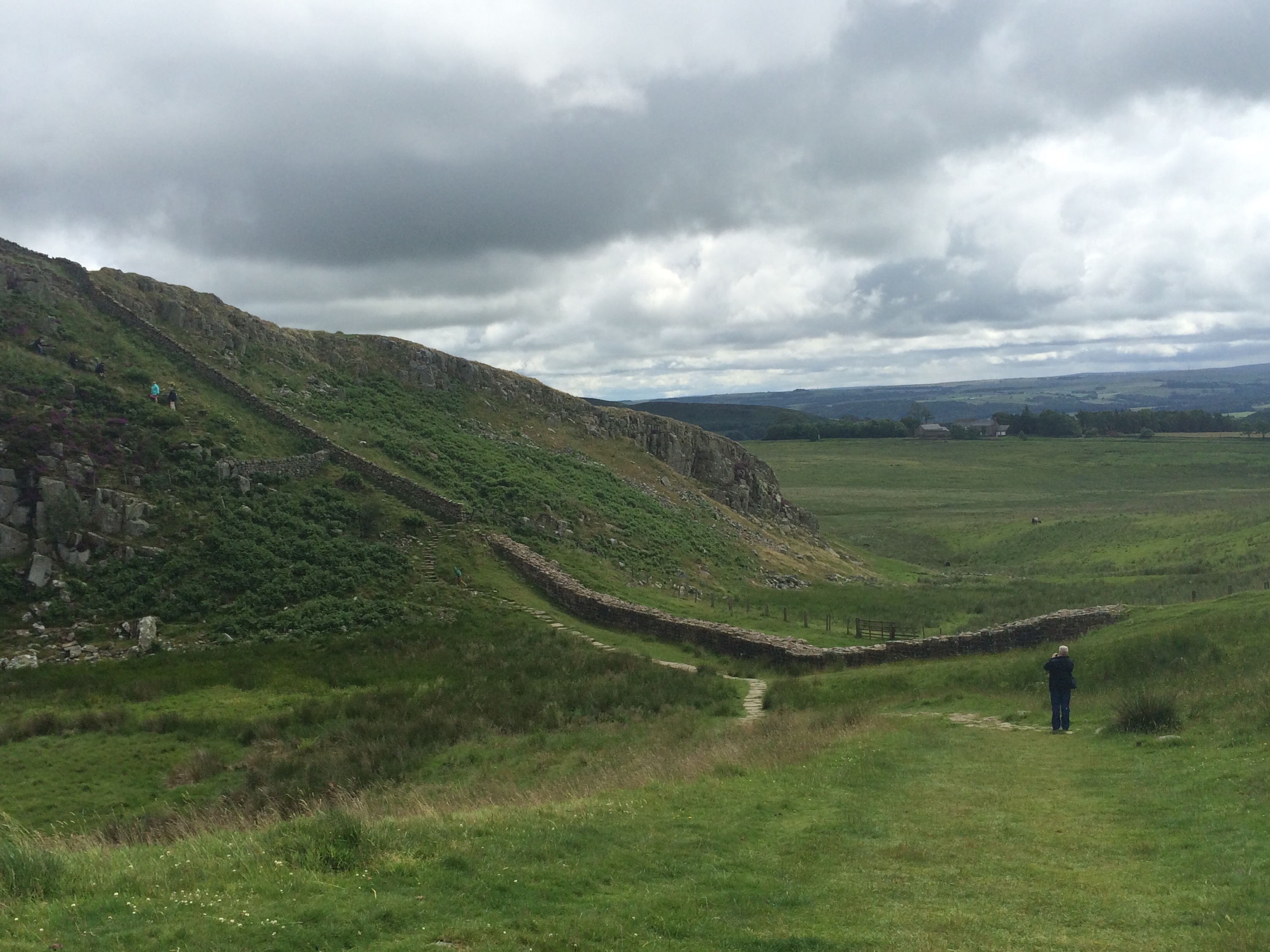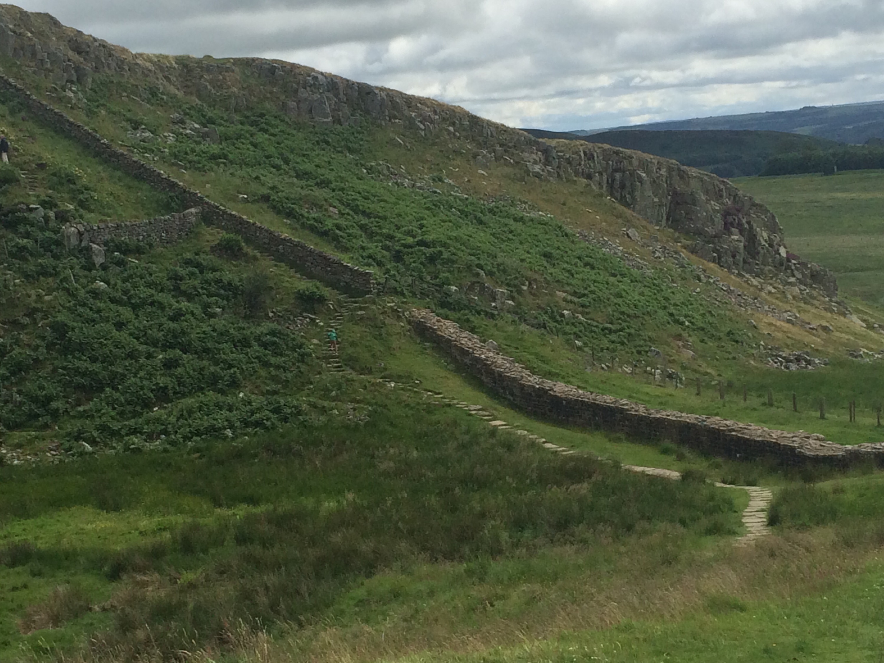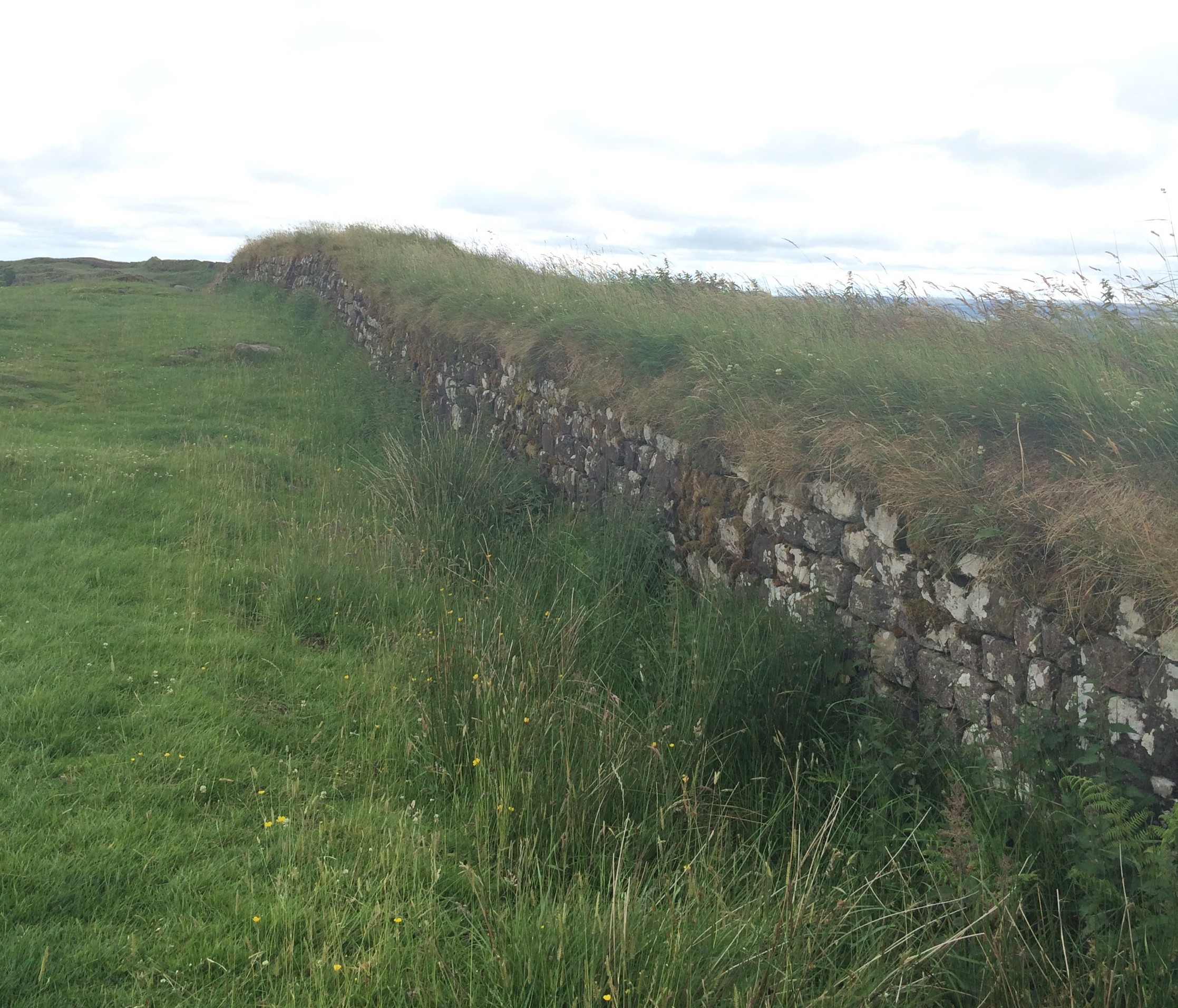 What you can’t really see clearly anymore is that on the other side of the wall there is a raised military road, a slight mound, another ditch called the Vallum, and a slight mound on the other side.