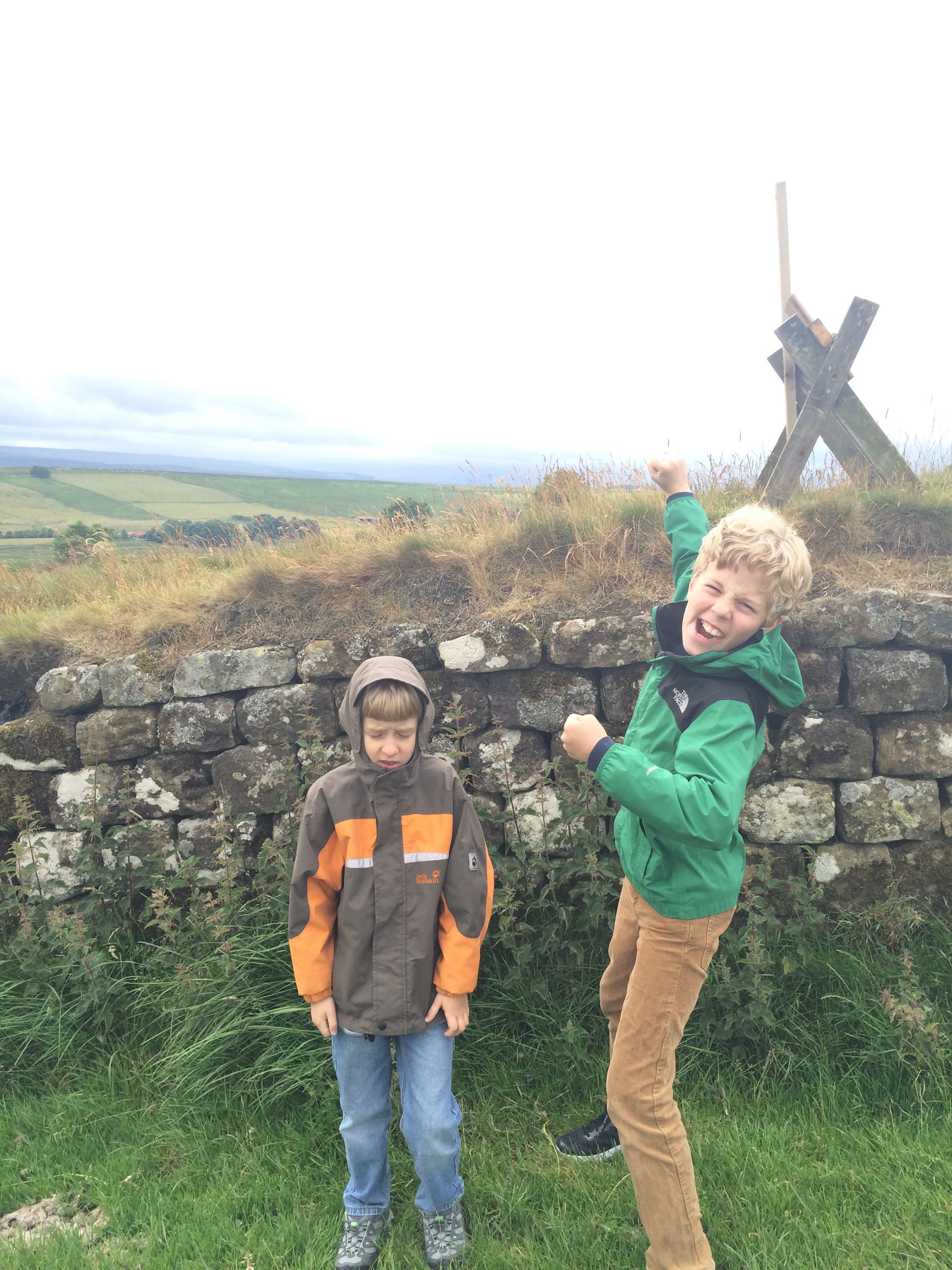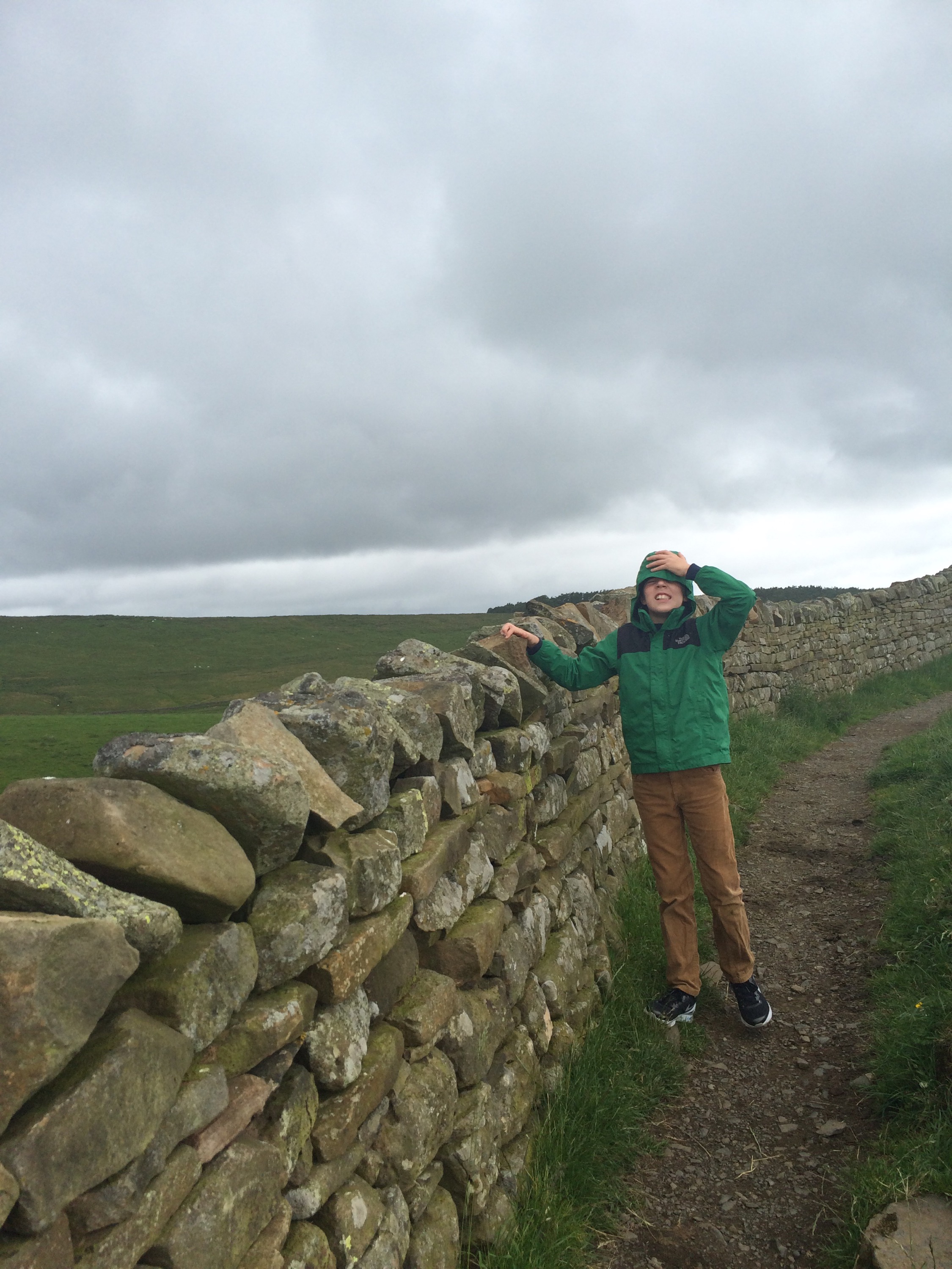 Finally we made it to Hadrian’s Wall. E was giddy with excitement. Here was an actual border of the Roman Empire. He burst out of the van and ran through a pasture to the Wall. He followed it down a hill and then scaled up a huge rise so he could get a good view. H stayed walking by me and made chatty comments about the wind.