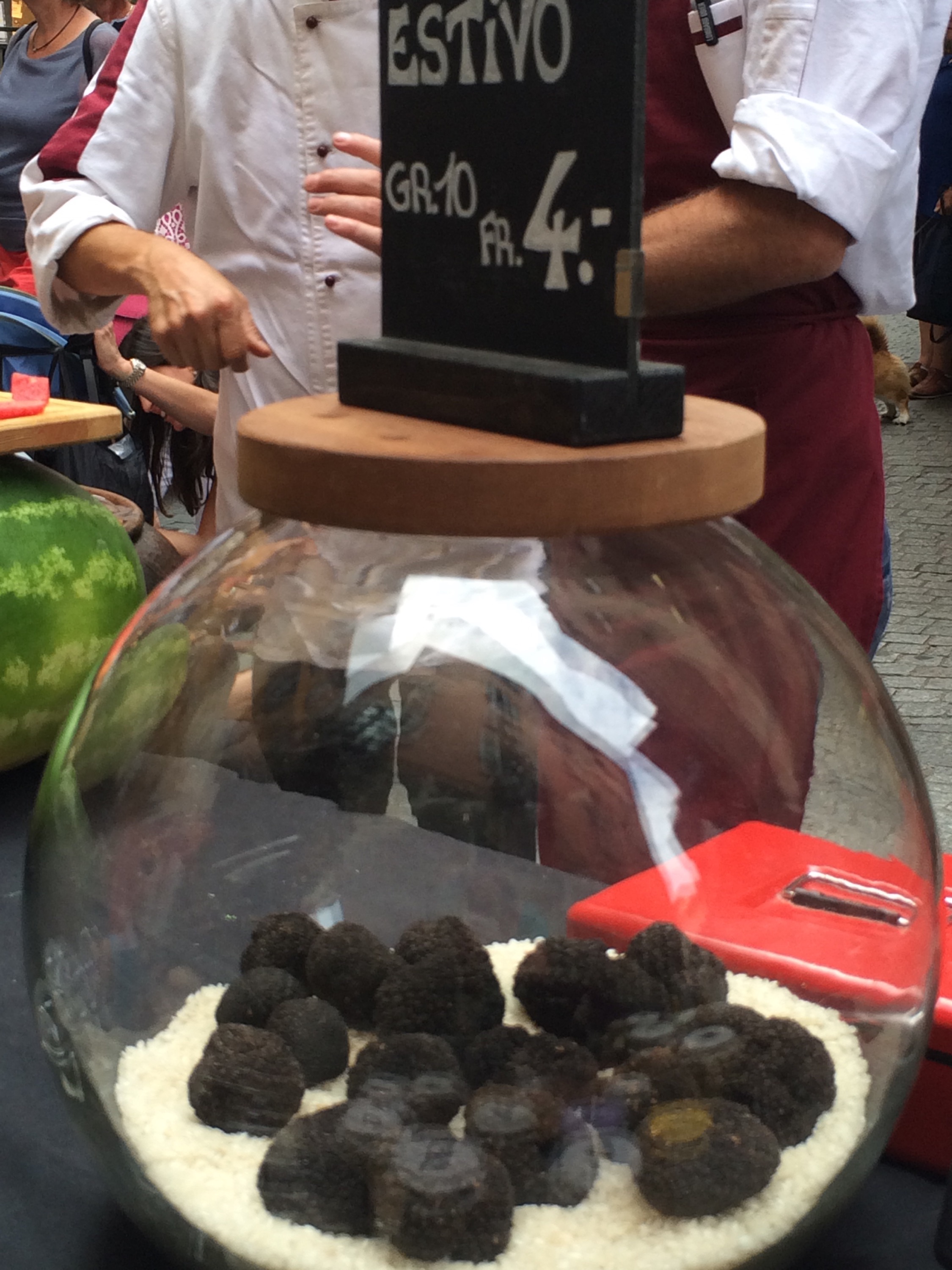 We were lucky enough to be there in the morning and we could experience the fresh foods market and street stalls. There were tons of foods to see, smell, and try. Including about $3000 worth of truffles. They are charging 4 francs per 10 grams of truffle. That would be about 1 franc per thin, thin, thin slice.