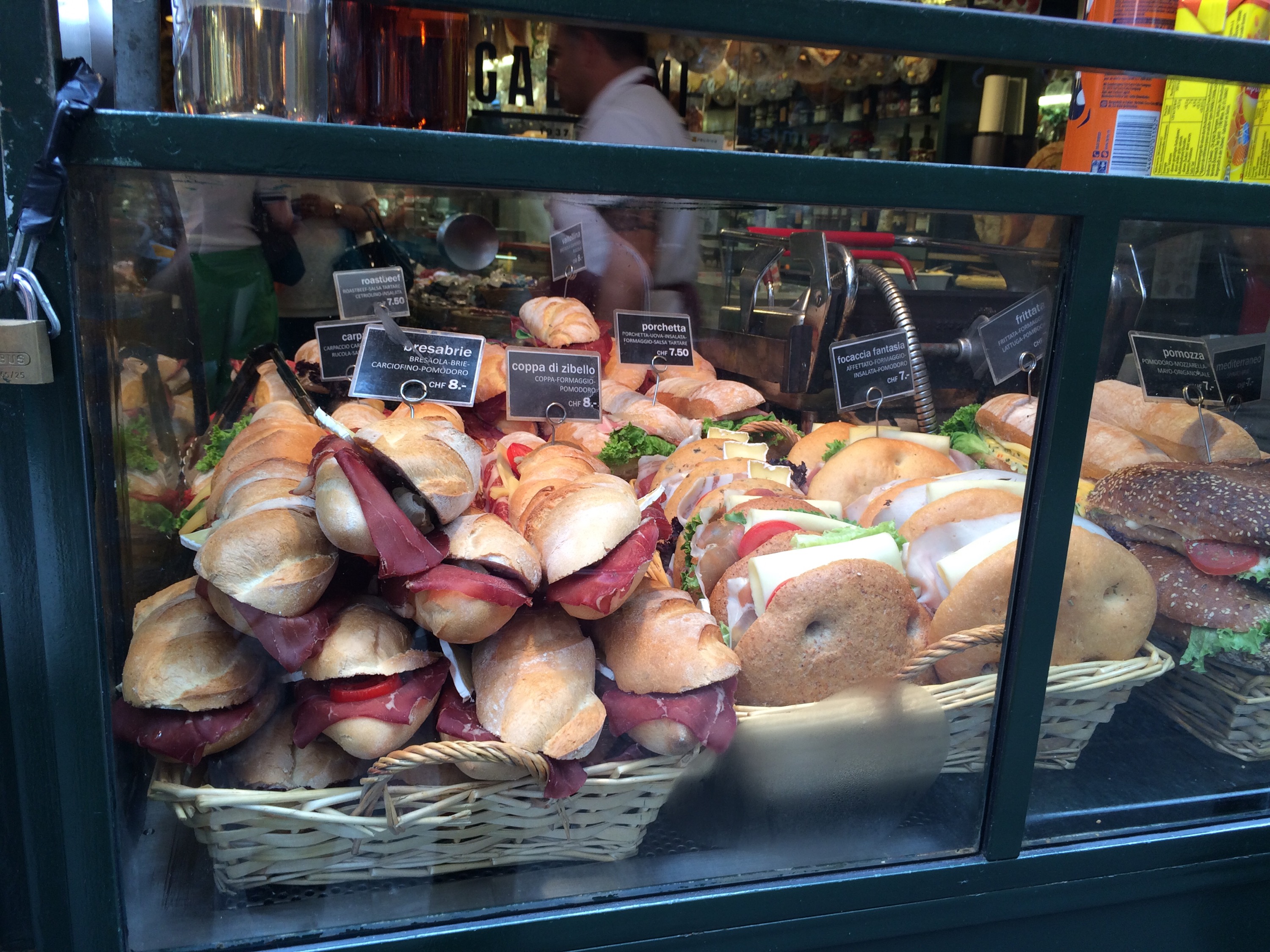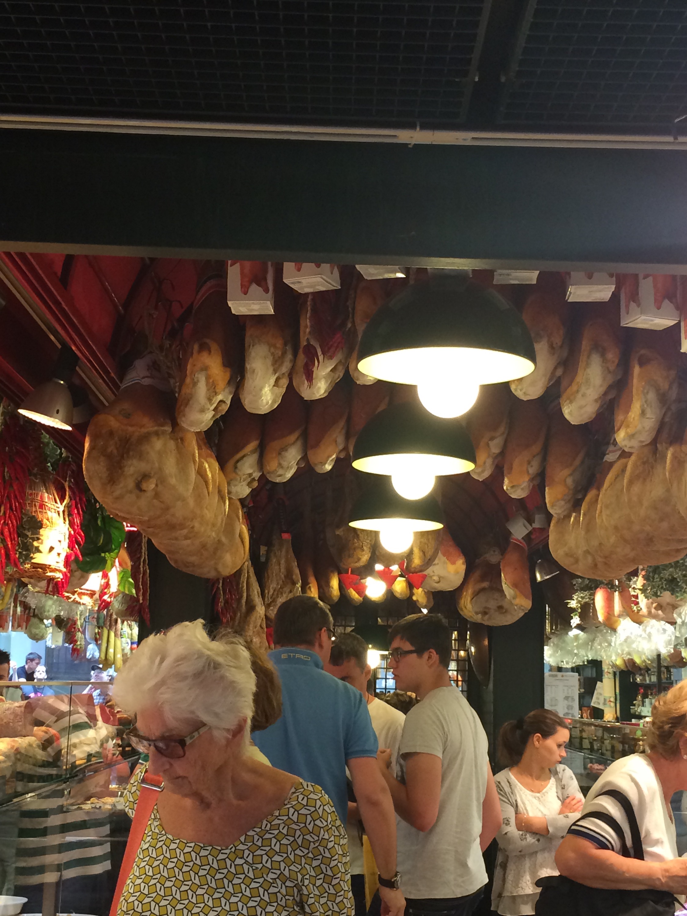 Right next to the bakery and the truffle sellers was this gem: A cured meats and charcuterie shop. It was a goodly sized shop packed to the rafters with cured meats. Look at those salamis hanging there!