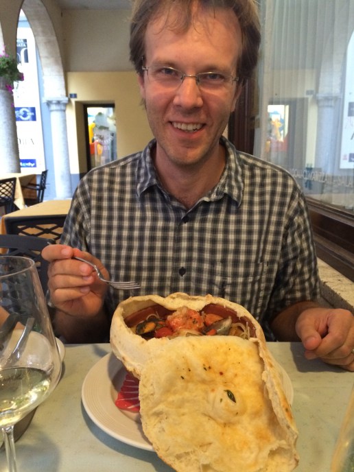 It’s a bowl filled with mussels, tomatoes, shrimp, and octopus in a white wine broth baked with a bread dome over the top, complete with a little bread pom-pom on the top that made it look like the stocking caps we used to wear as kids. I wish I could have gotten a picture of it closed, but our waiter was not wise unto the ways of food blogging and cut the top off before I could fish my camera out of my pocket.