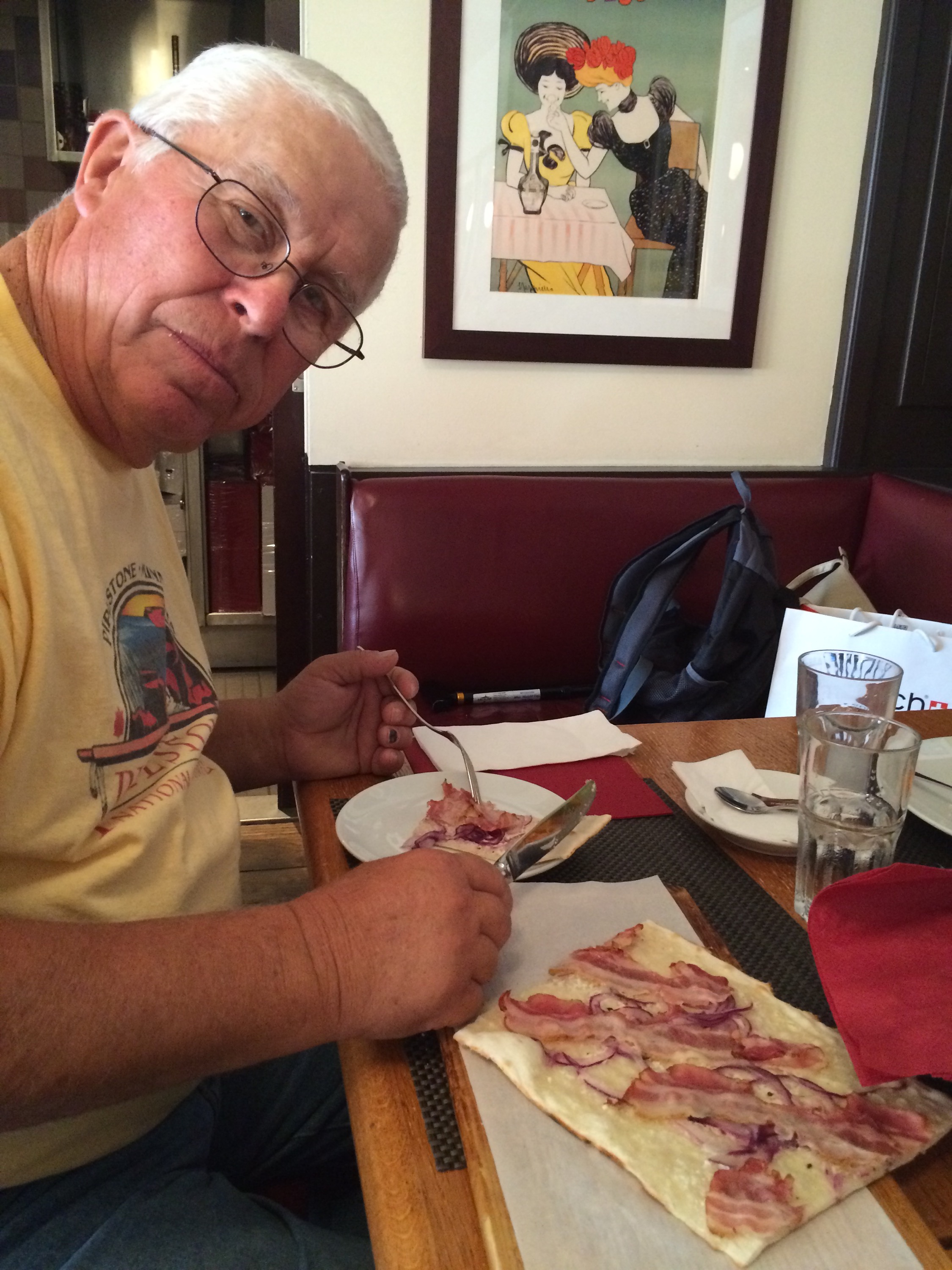 And here is Dad with the Traditional Flammenkuchen – bacon and red onion.