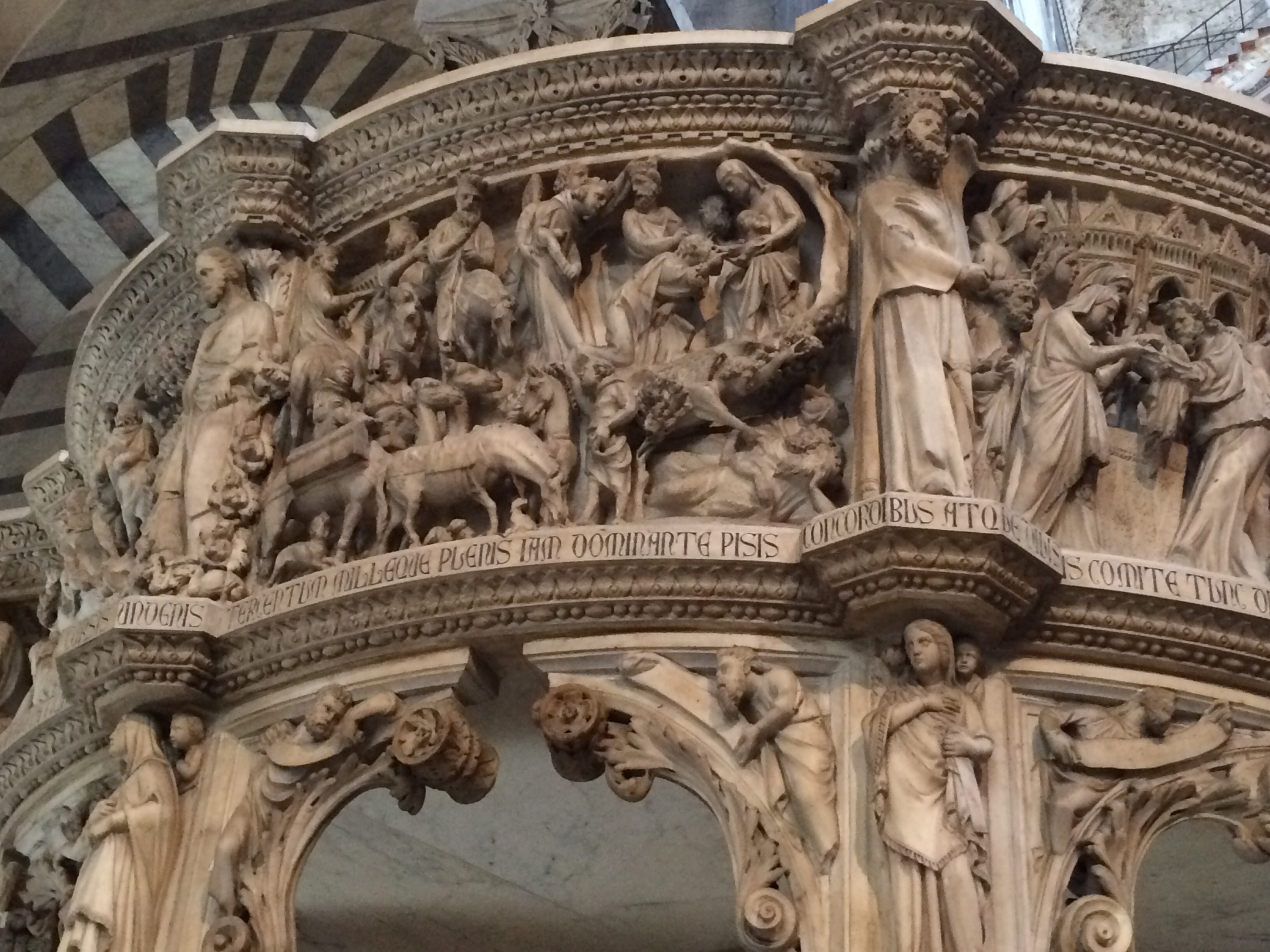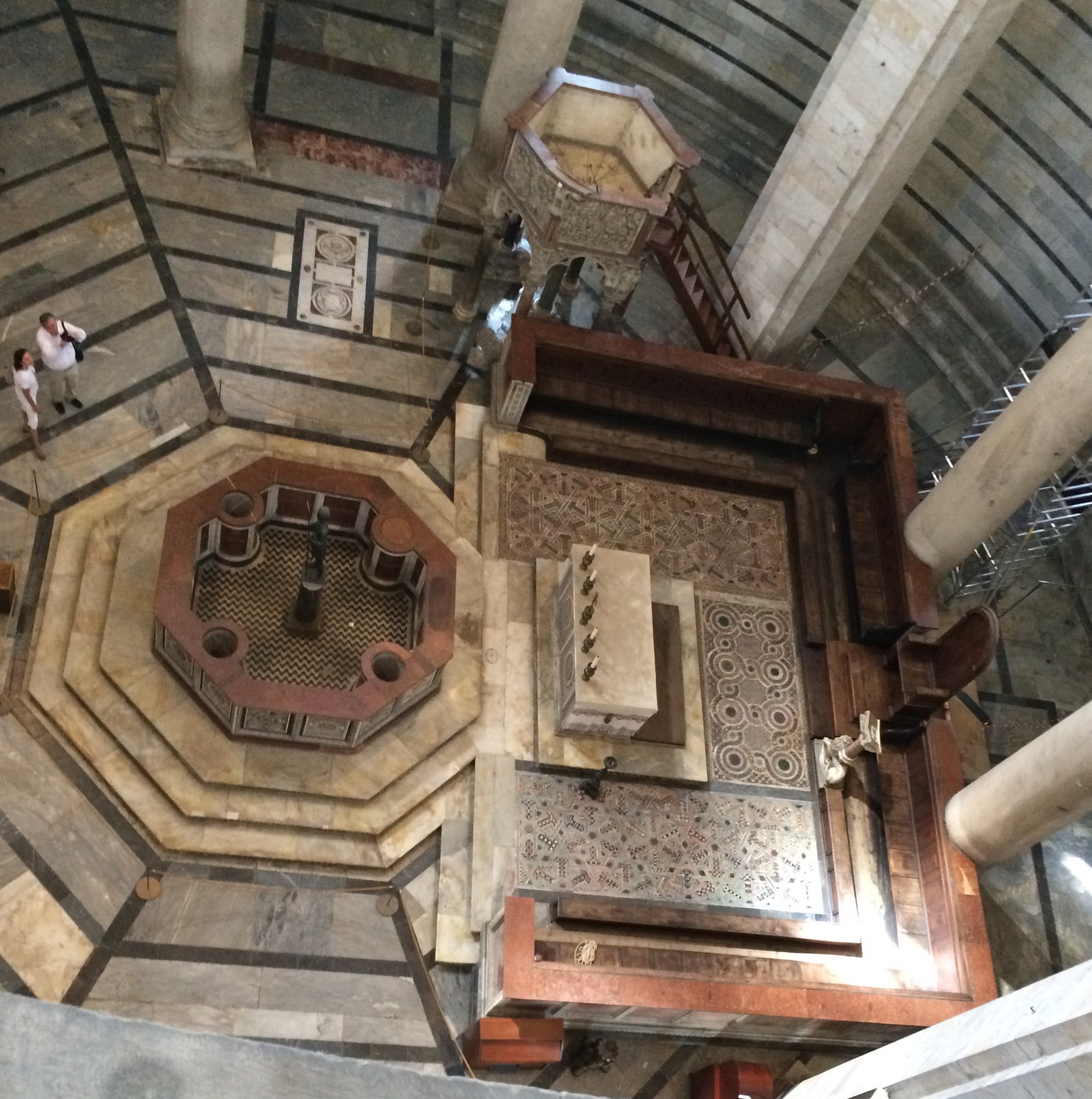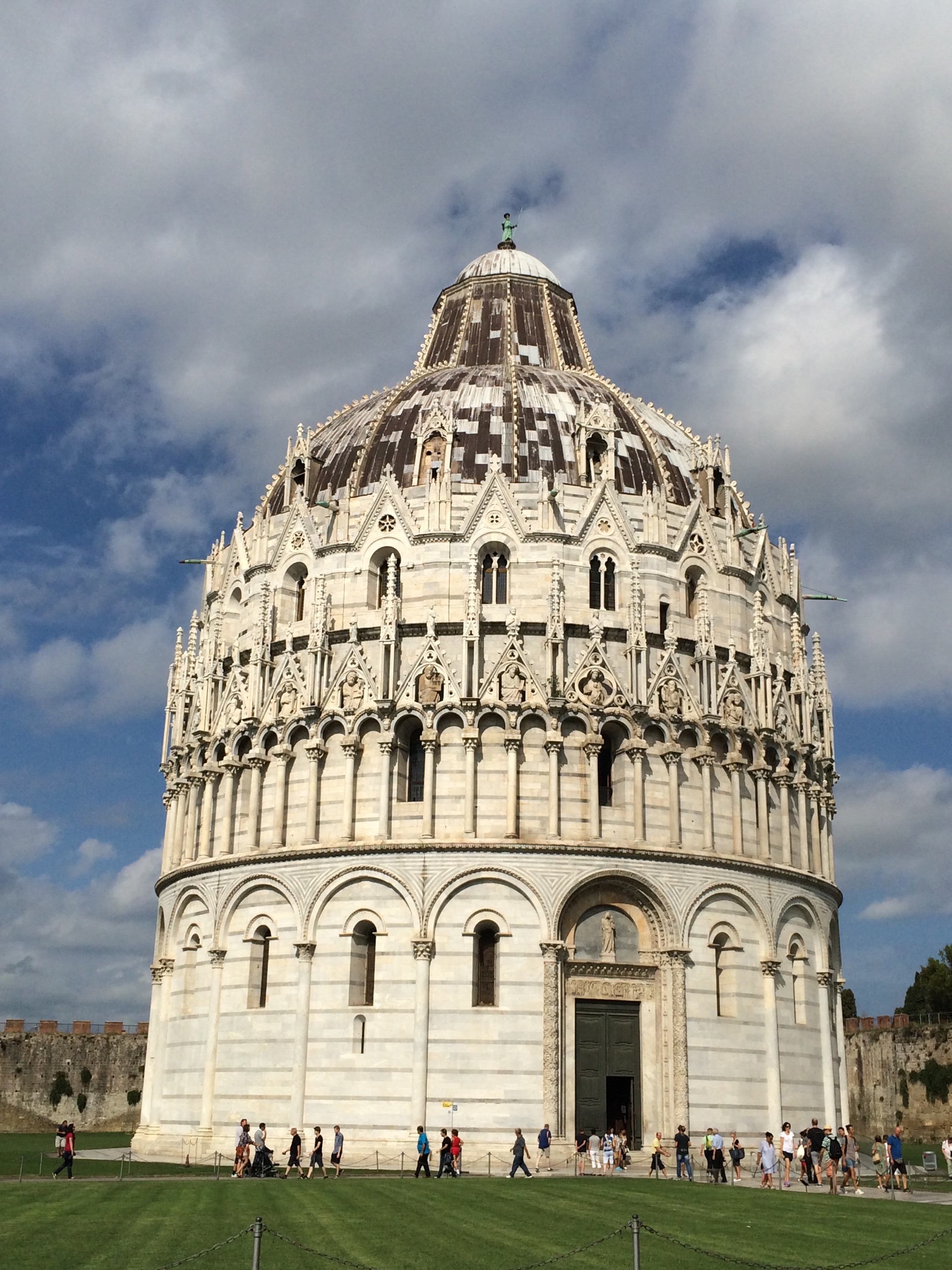 It’s a wonderfully round and white building in the 12th century Romanesque style. It is dedicated to John the Baptist, with a sculpture of him at the top like a cherry on a sundae. The building was started by one gentleman, but was finished by the Pisano brothers in the 14th century. It is actually just a little taller than the Tower of Pisa, but doesn’t seem to have the same tendency to lean as it has less clay in its foundation.
