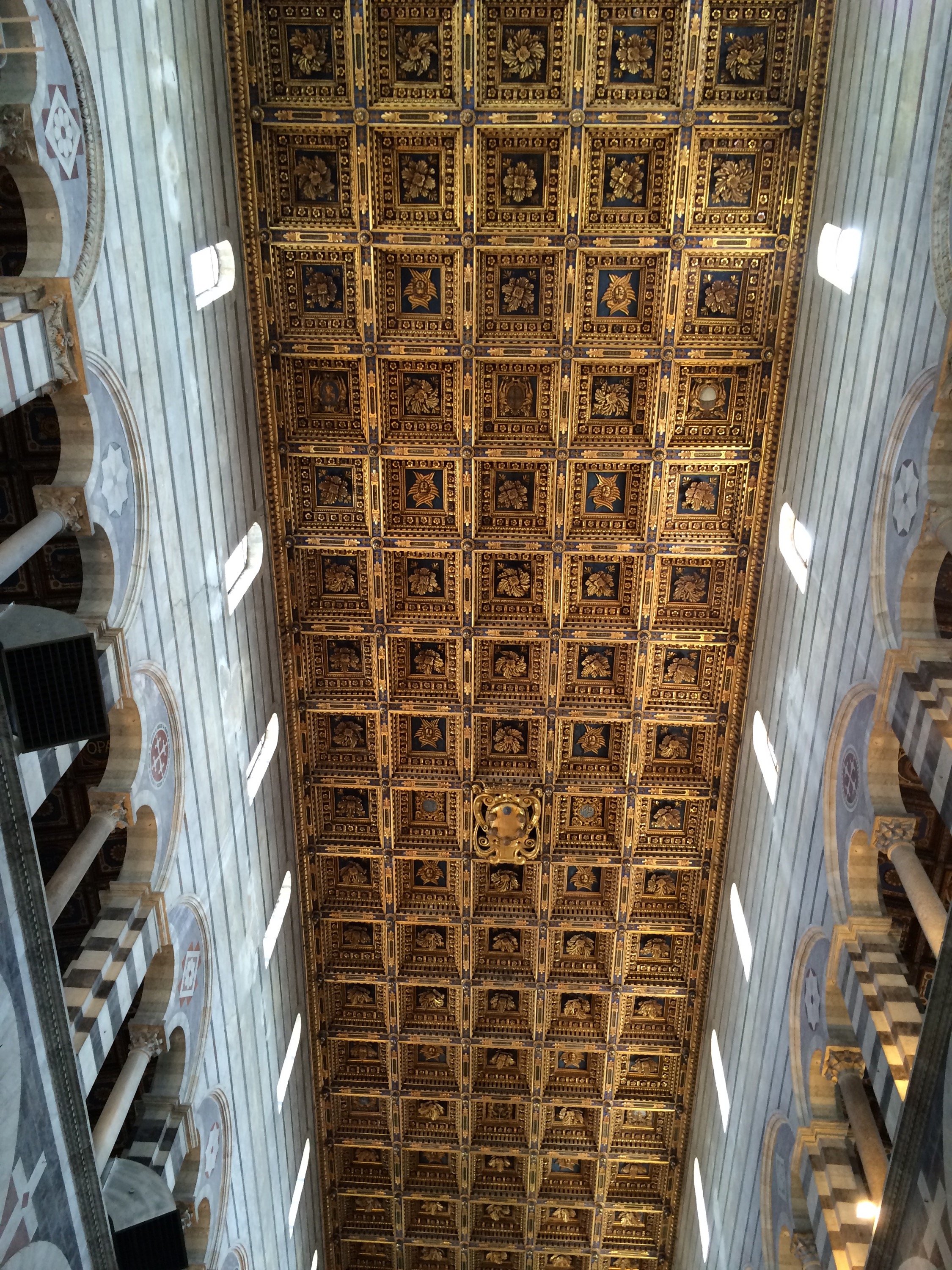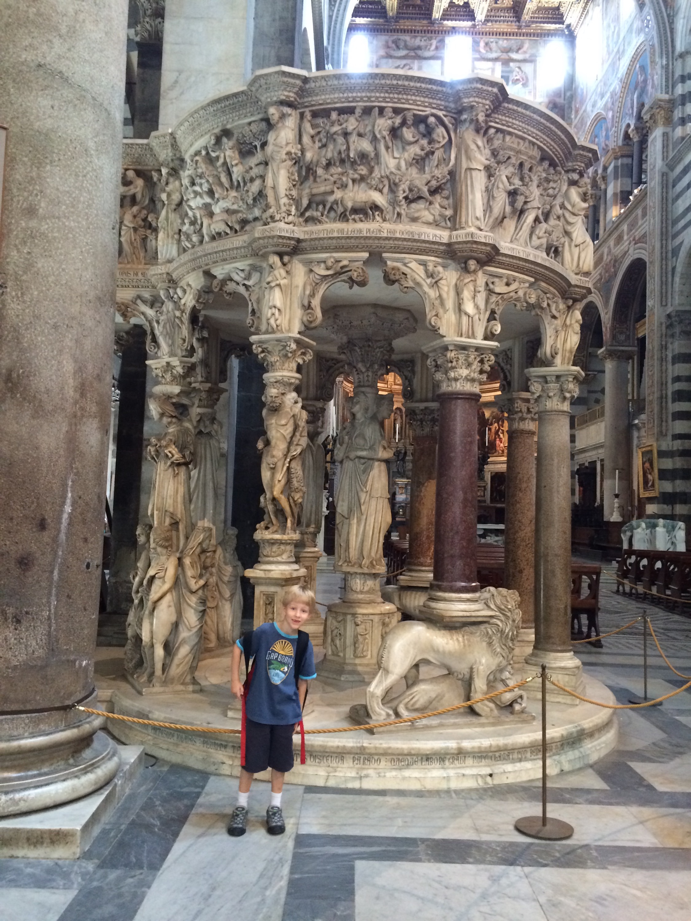 Legend has it that church services were a tad long and tedious for Galileo so he’d stare at things in the Cathedral, like the lamp (not this one – the original one is now hanging in the Camposanto). He stared at it sway back and forth for weeks and eventually developed his pendulum theory. That did get E to sit down and watch it for almost exactly 2 minutes before he started reading the book he’d brought along for just such an emergency.