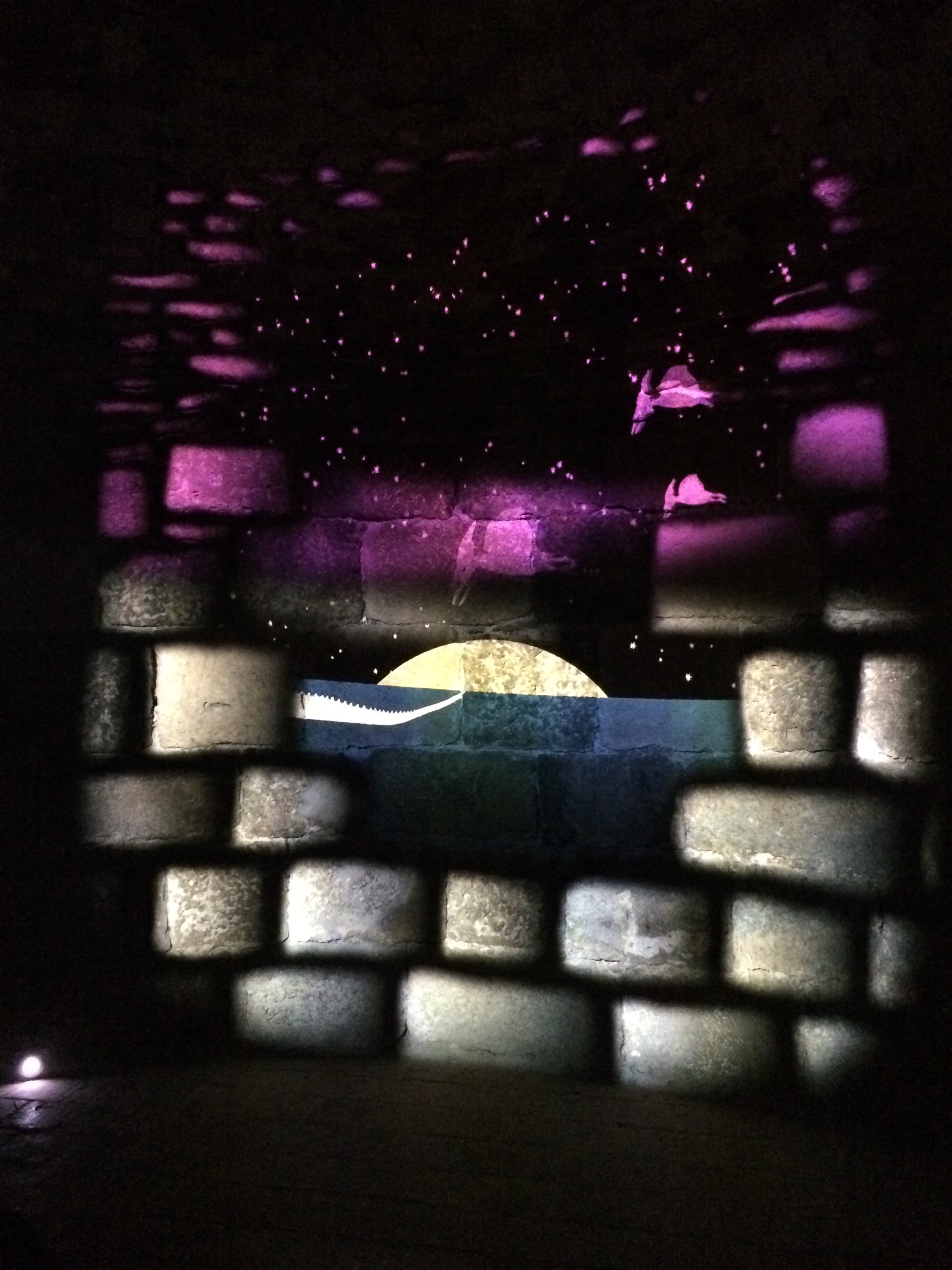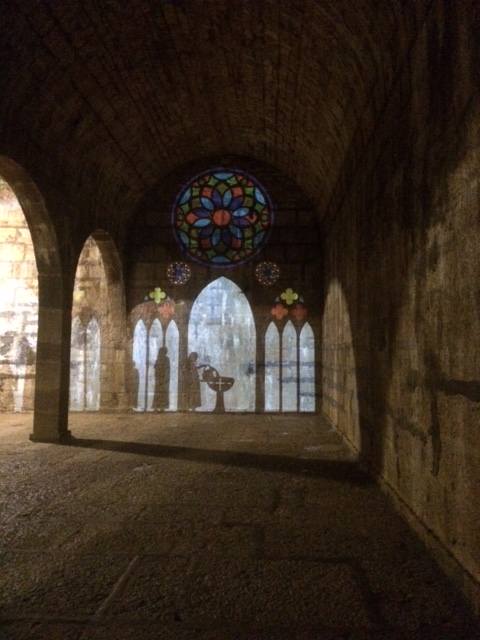 A movie started. We pieced together Mark’s rusty French and my partial German and read that this room was part of an underground aqueduct or cistern where people dumped things like bikes, tubas, shoes, and murder weapons. Before that it was a chapel. The movie reproduced what they think this chapel with stain glass windows looked like, complete with monks and nuns.
