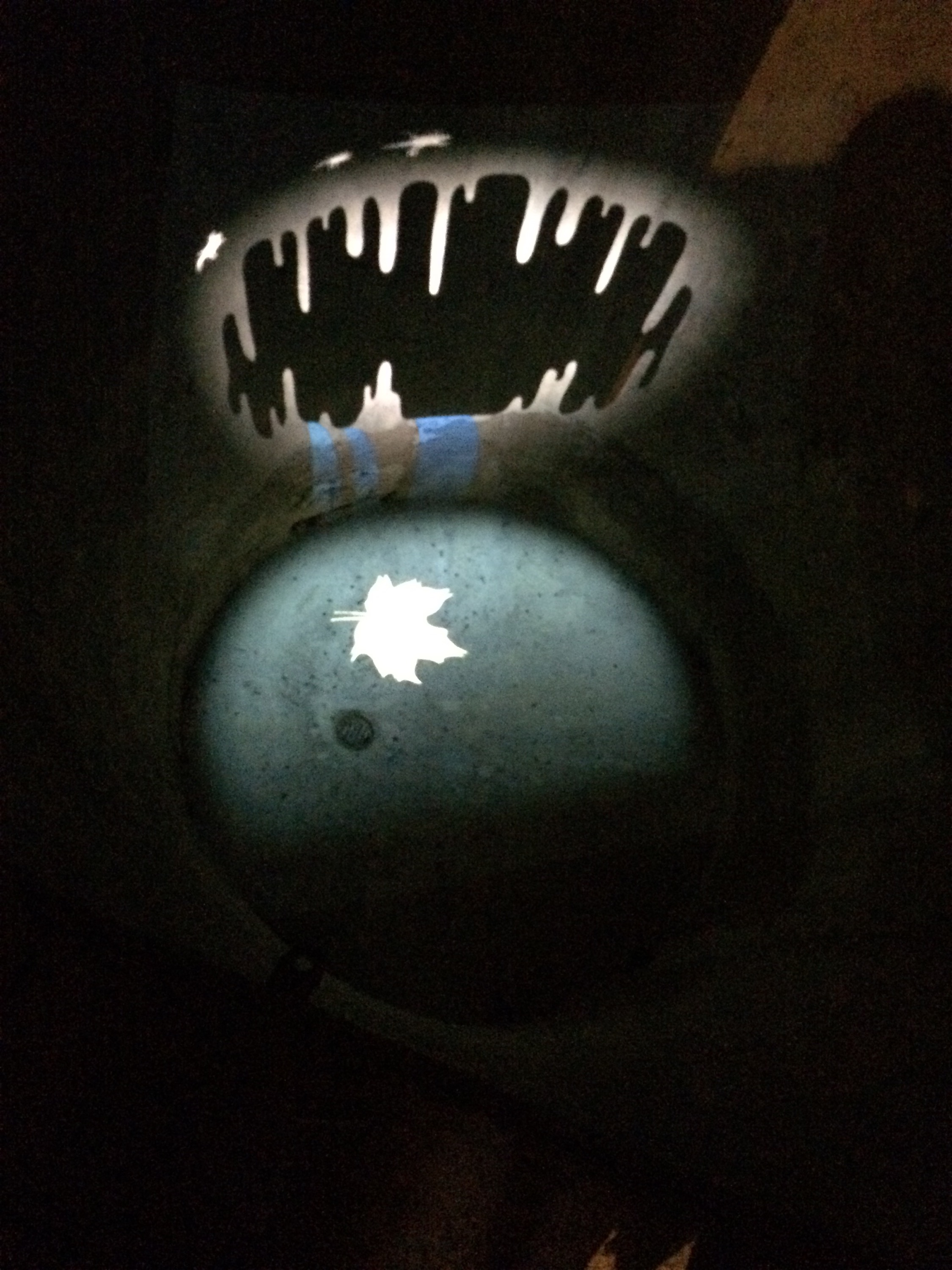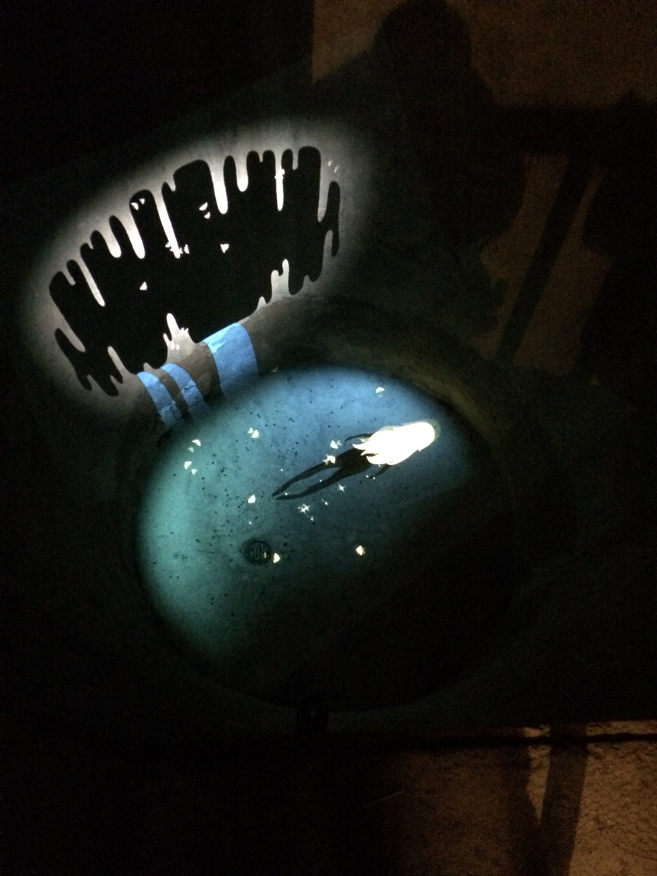We unlocked the brown door under the stairs and went through a long hallway that smelled strongly of lemon Lysol disinfectant cleaner until we found another door to unlock. And we were in the back yard! Then we saw another door with the Secret Circuit key symbol above it and we found ourselves in a cistern. A magical cistern.