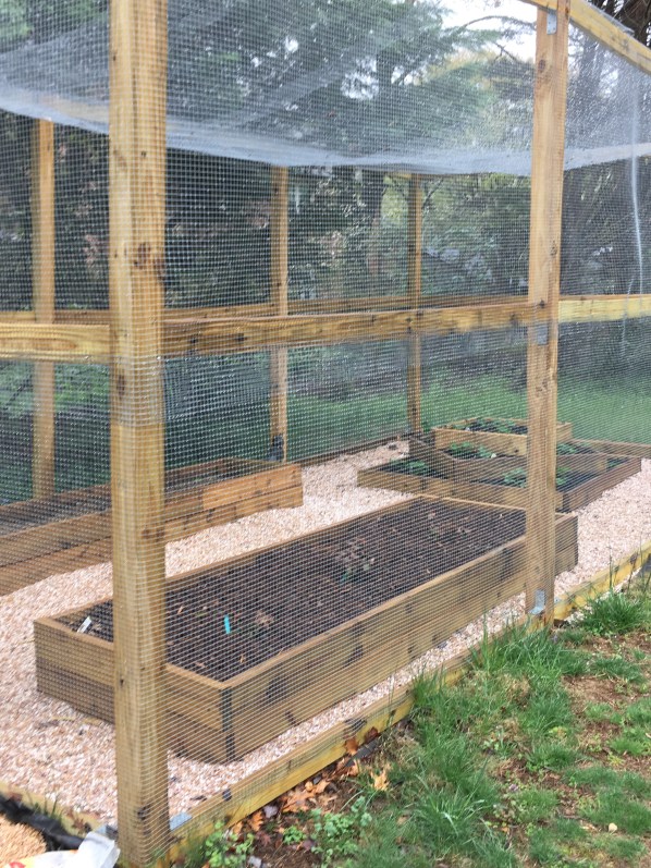 All summer long he augered in the posts by hand to create an 8-foot fence that would discourage even the most determined deer. Then He and his dad put up the fencing and the mesh roof on the fruit bed. We used regular animal-proof fencing for the vegetable garden and then got hardware cloth to keep the birds away from the precious, precious raspberries, blueberries, and strawberries that we would be growing.