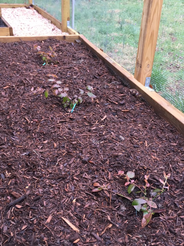 The blueberries are in. They were beautiful bright emerald green when I planted them. After a flurry of Googling I learned the bright emerald leaves turn purple when they get cold. They are greening back up rapidly, which is a relief.