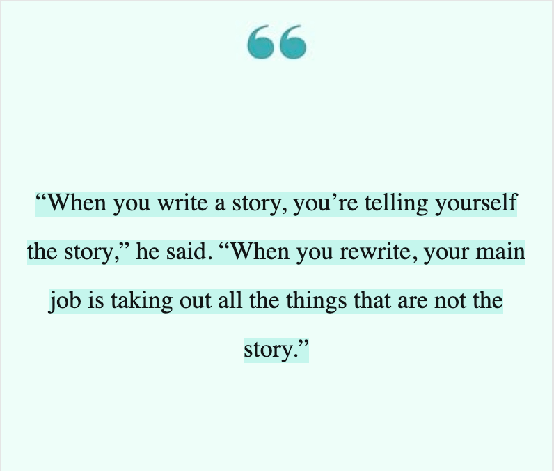 All writers want their stories to be great. And getting those stories out is very hard work. Word choices, action flow, plot beats. It can all feel so mysterious, it’s nice to hear how one of the most successful writers in history produces one compelling story after another.