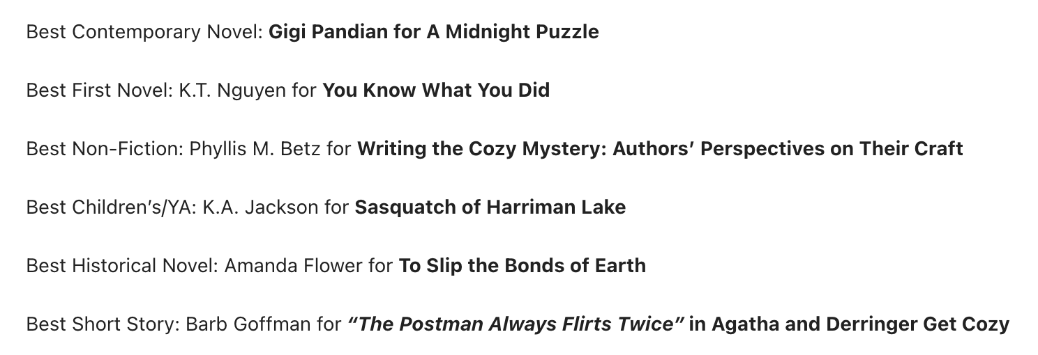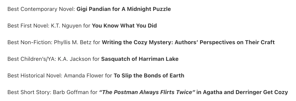 Of course, the big event is the banquet where the Agatha Awards are given. It’s a huge honor to win an Agatha, and I want to congratulate the winners.