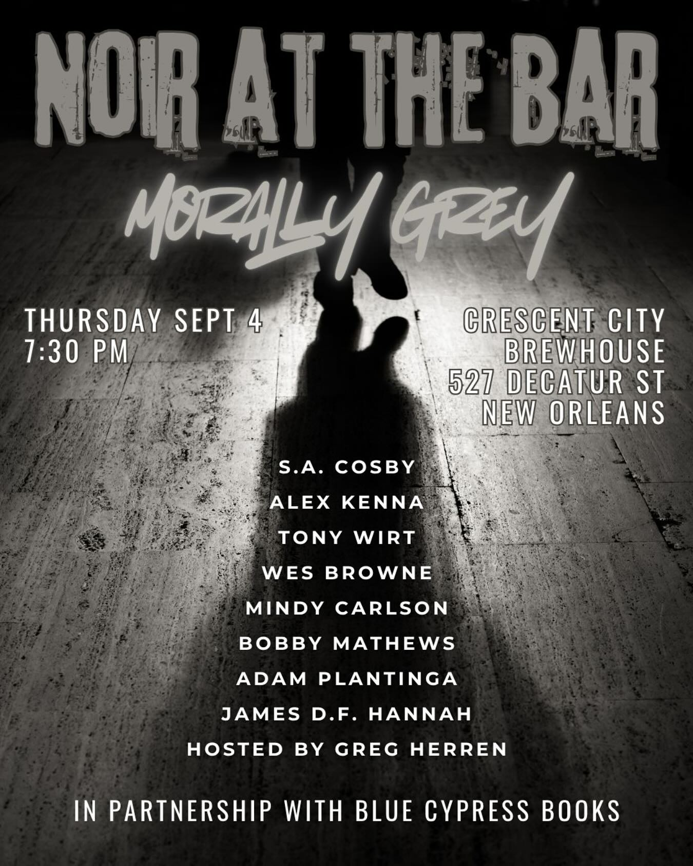 I’ll be reading a very, very abridged version of this story at the Morally Grey Noir at the Bar this Thursday at 7:30pm in New Orleans. The line-up is a banger, so prepare to be entertained!